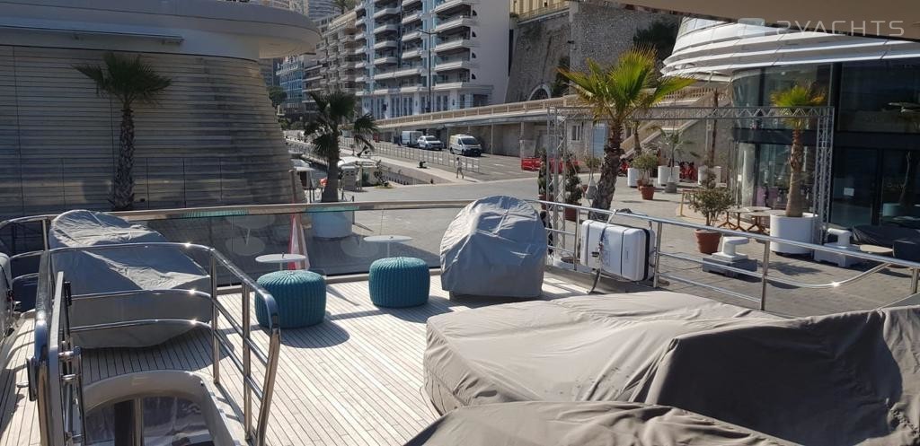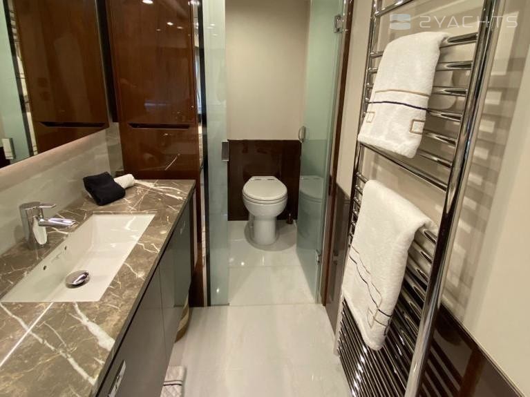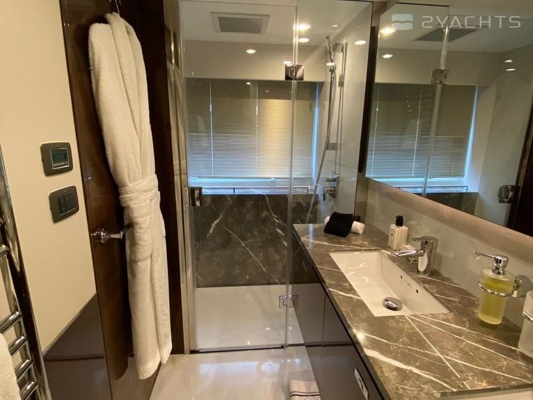 Twin MAN V12-1900 (2x 1900hp) Diesel engines • White hull • 4 Cabins accommodating 9 Guests plus 2 Crew cabins - up to 4 crew • 2x 27kW Diesel Generators • Sleipner Hydraulic system • Watermaker • Full air-conditioning • Bow and stern thruster • GRP Flybridge hardtop • Skylight in cockpit • Electro hydraulic raise/lower system to transom platform • Tender chock mounting system on bathing platform • Flybridge wetbar • Underwater transom lights • Cockpit and flybridge cover • Electro hydraulic trim tabs • Raymarine Axiom • Additional high level berth in captain's cabin • Miele wine cooler • Kelly Wearstler post rug • LED TV's