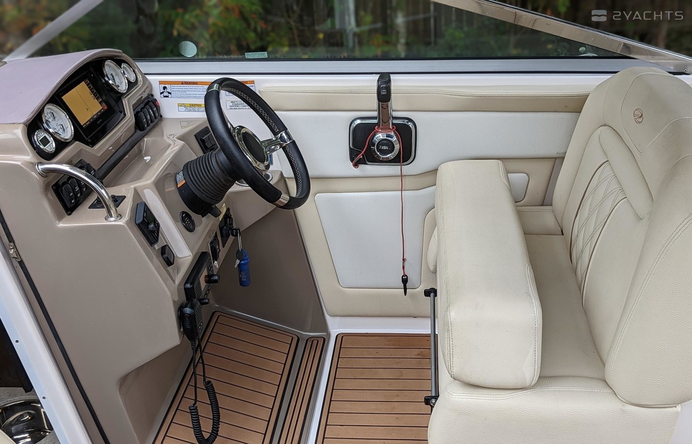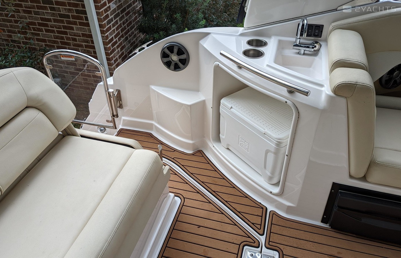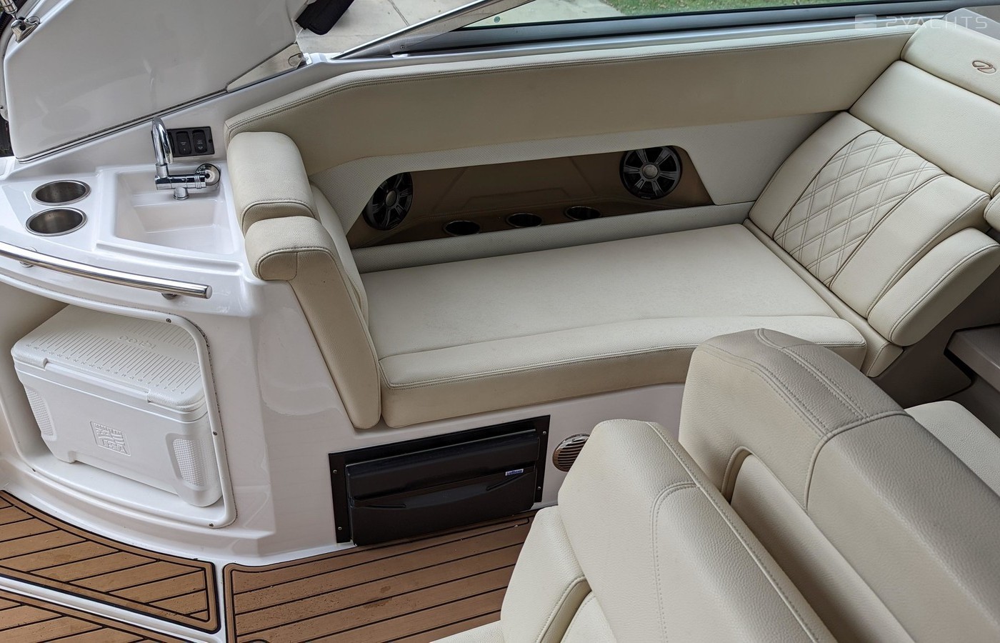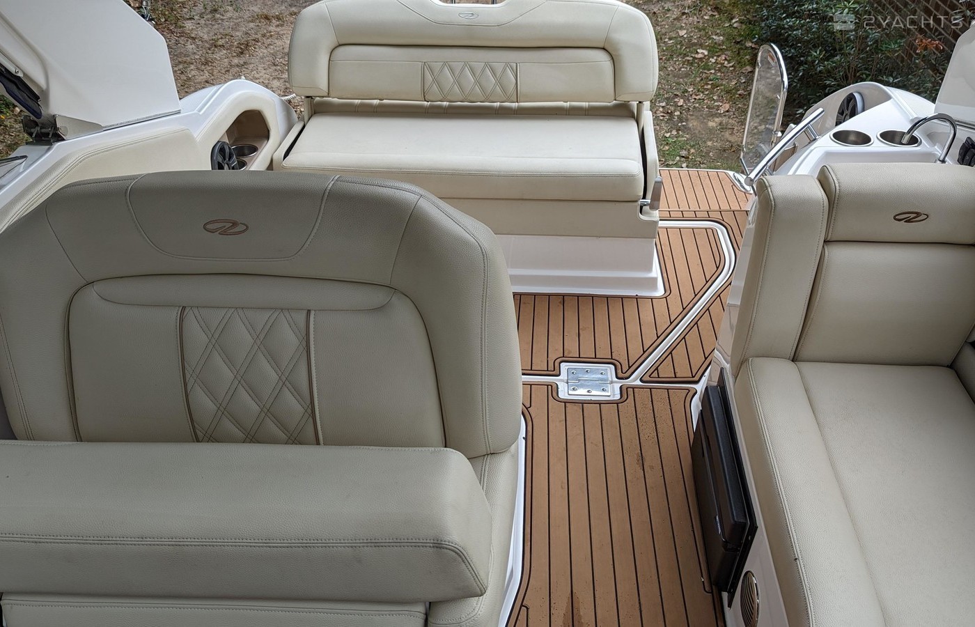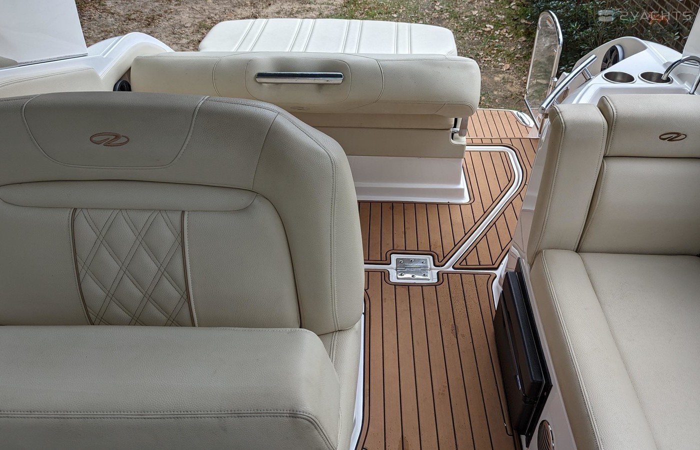 When you are done being cool and all, chill out on the forward deck sun pad (not pictured, but never used and included) or on the rear lounger. There is plenty of room for everyone looking to soak up the sun. When you're done cooling off in the water, getting back on board is easy with the large swim platform. The cockpit deck area and swim deck are also covered in Seadek foam flooring in a teak wood appearance.