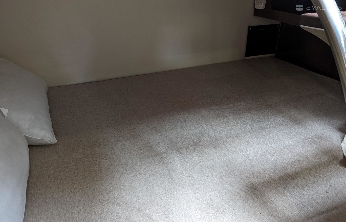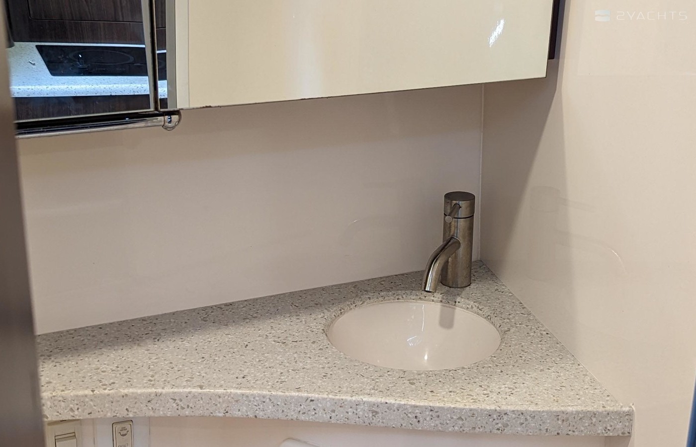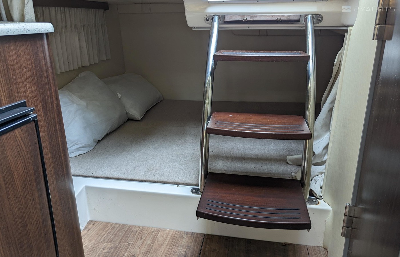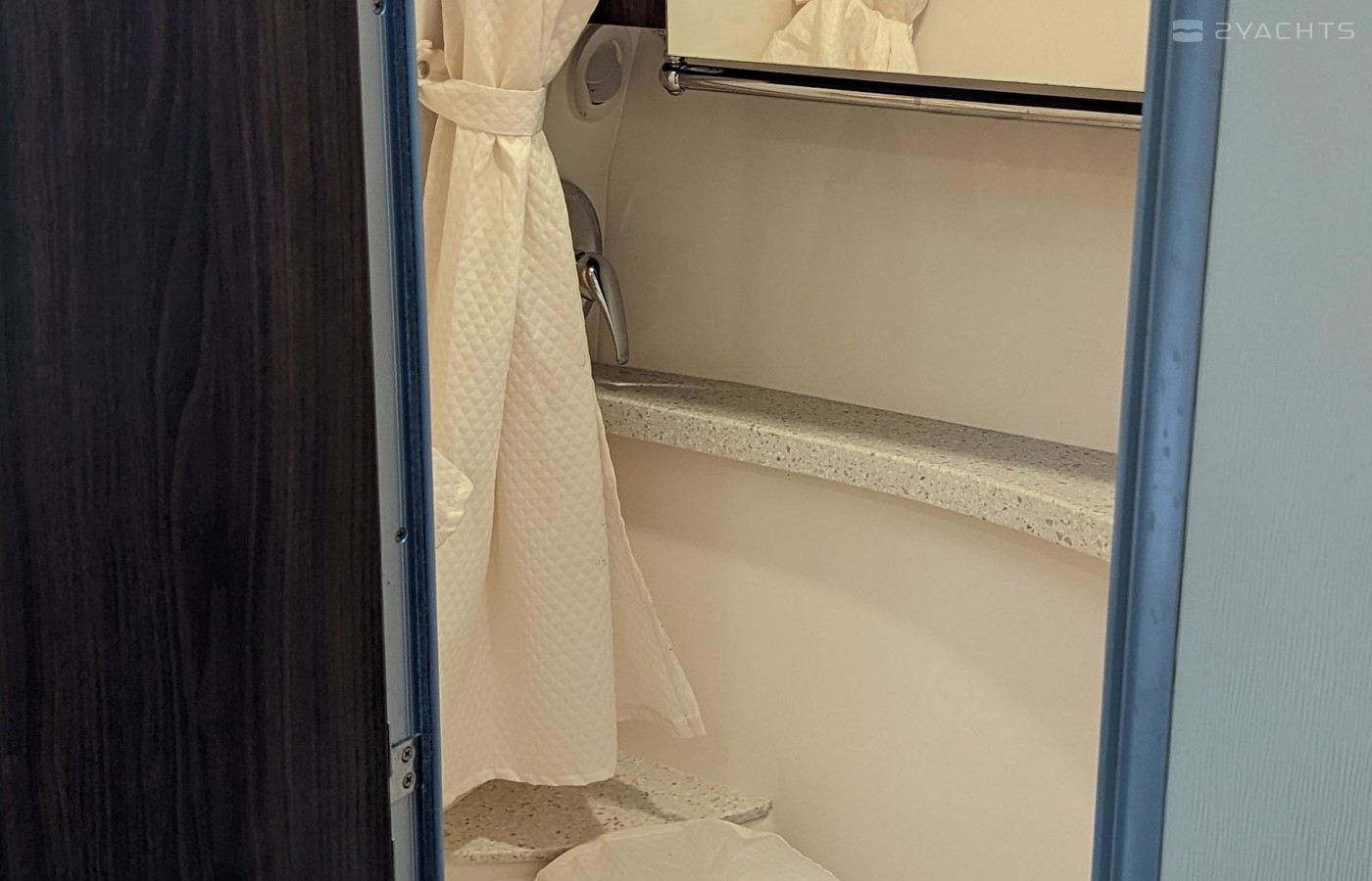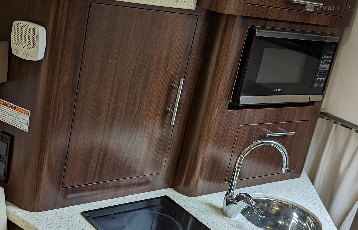 There is a refrigerator in the salon/cockpit area and one that is standard in the cabin/stateroom kitchen area. The kitchen also has a microwave, electric stovetop, and sink. The bathroom is the largest in the boat's class with six feet of headroom. There is a dedicated shower, solid surface countertops, and black cherry cabinetry. The large hull side windows on both sides of the boat are a beautiful touch, from the inside as well as the outside.