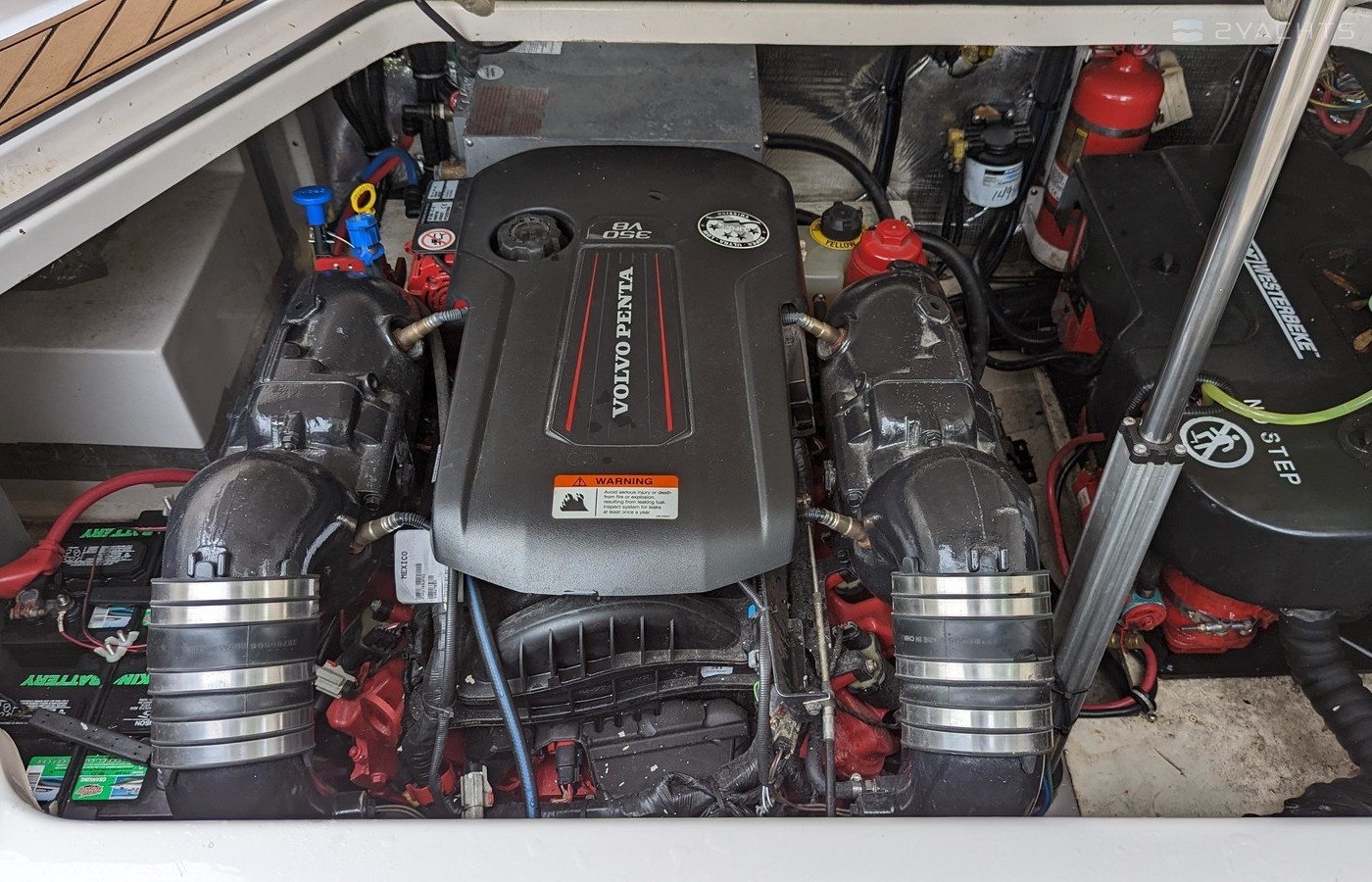 Our Regal 28 Express has the upgraded Volvo Penta 350 V8 engine, obviously more powerful than the standard 300 you'll see installed on other Regals. This more powerful engine only has 88 hours of use on it. You read that right, 88 hours. You may not find a lower usage anywhere searching for a great boat like this one. The duo-prop on the outdrive gets this boat on plane quickly and gets you near 40 mph within seconds. This big motor gets powered by good ole' petroleum and the 73-gallon gas tank on this boat will be full when you take possession of it, no matter how high inflation gets.