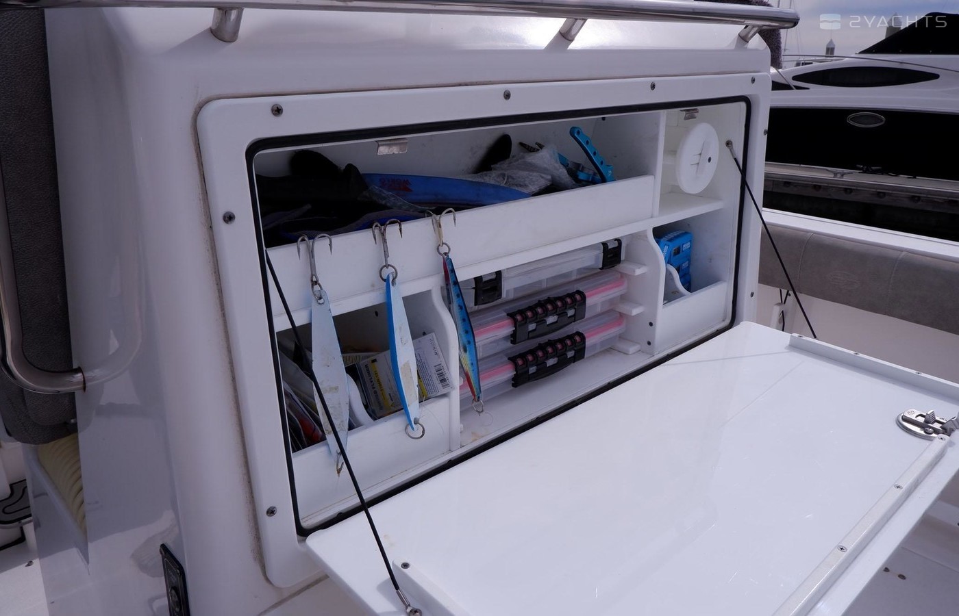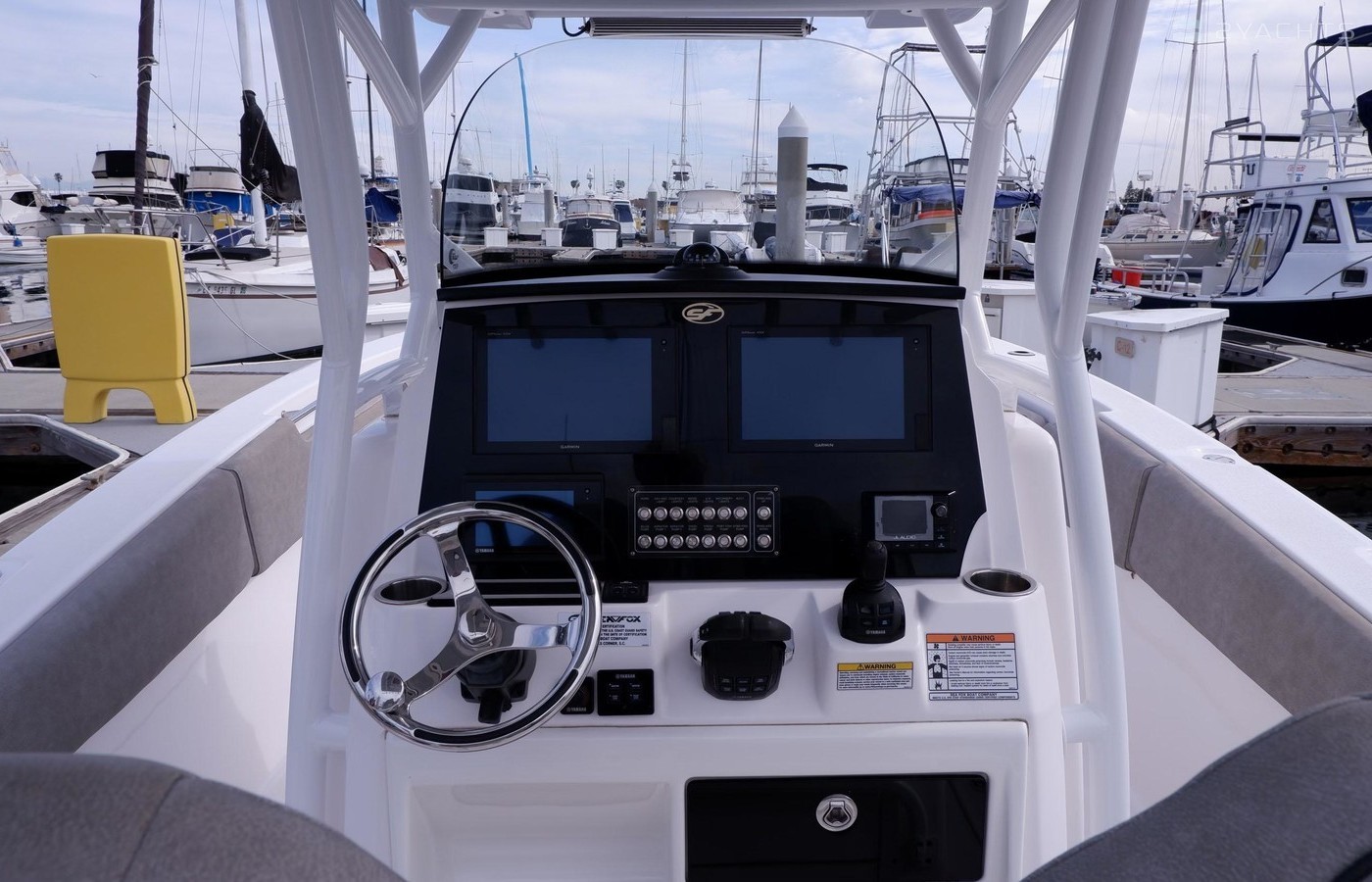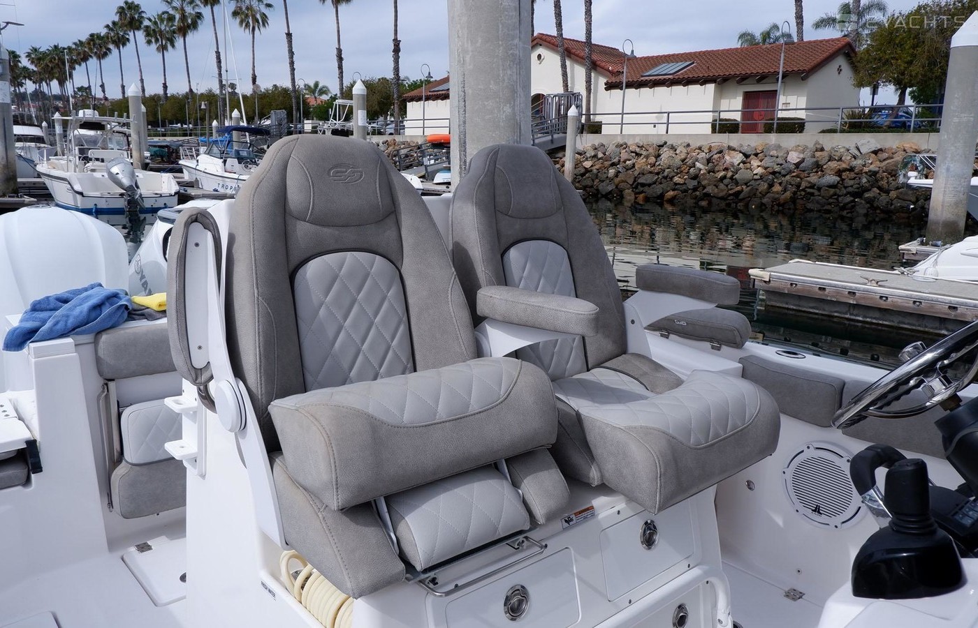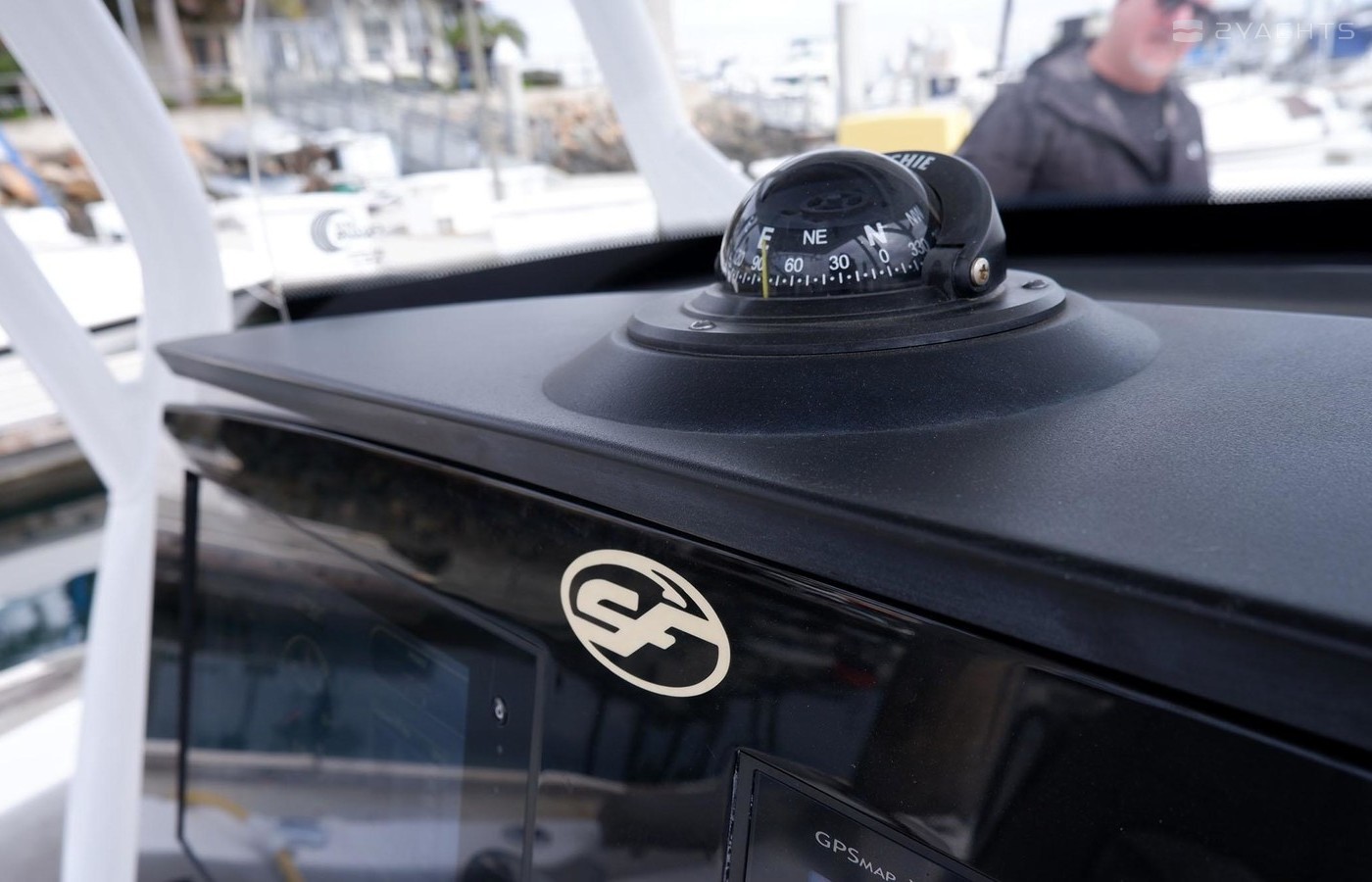 Standard Features· 28 12-volt power point · Anchor - windlass system w/controls at helm & bow switch · Anchor compartment w/anchor roller chute, chaff plate, safety strap & rope access · Battery switch · Bilge pumps - automatic (1100 GPH) (1 primary & 1 back up) · Boot stripe (silver) (only available on White Pearl hull) · Bulkhead fittings for hydraulic hoses (splashwell) · Cockpit - self bailing w/SST grates · Cockpit - side door access w/SST frame · Composite hull & deck · Console - black acrylic face · Console - coffin box/lounger w/armrests (40") · Console - compass · Console - dash shroud · Console - dash space for flush electronics (compatible for (2) 12" displays) · Console - dash "SF" backlit logo · Console - door (lockable) w/magnetic bottle opener · Console - finished interior & fiberglass inner liner · Console - footrest/storage insert · Console - full digital gauge instrumentation (single multifunction digital gauges, tachometer, speedometer, volt, fuel, fuel management, backlight & push button functions (for XCA twin motors) · Console - horn · Console - portlight (2) · Console - sink w/Corian countertop · Cooler - 65-qt Yeti w/ mechanical slide-out · Cup holders (14) · Fish boxes - insulated in floor w/overboard discharge (2) · Fuel/water separators · Gel coat - Isothalic & vinylester barrier coat (hull & deck) · Jump seats - w/below deck storage (1) (flip up) (cockpit) · Lights - courtesy (LED) (2) · Lights - live well lights