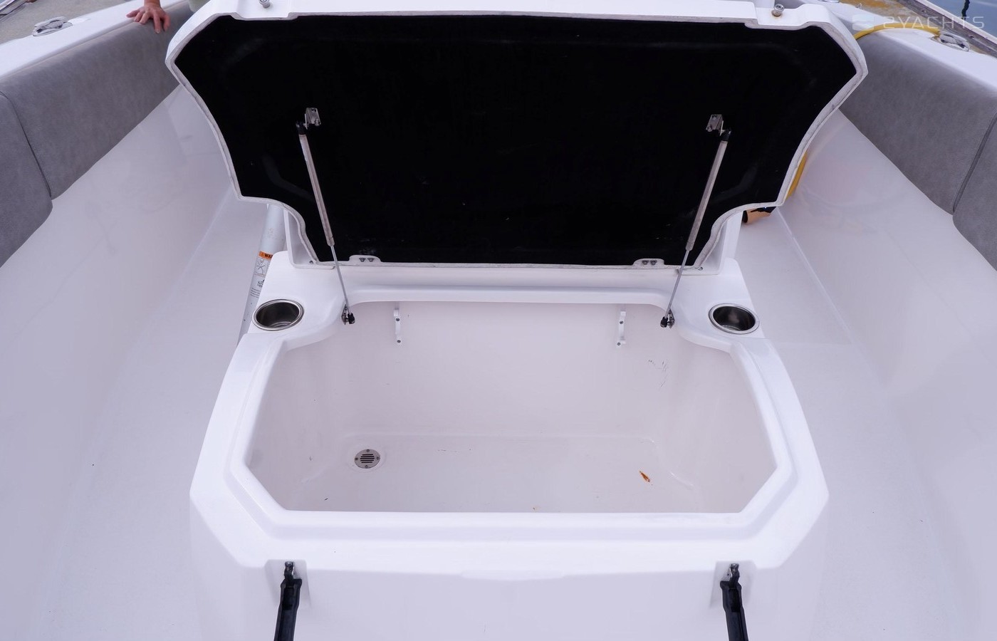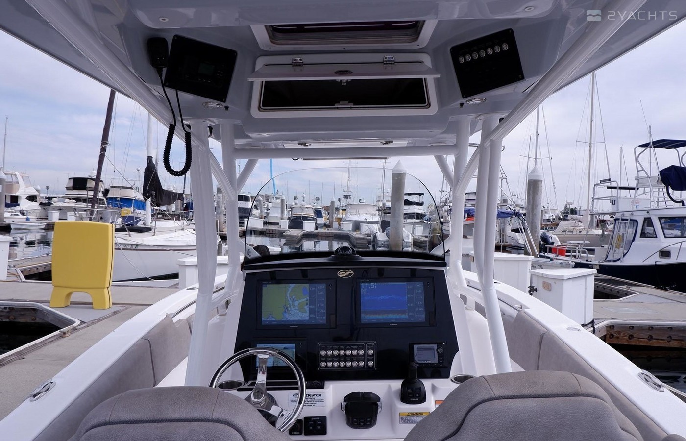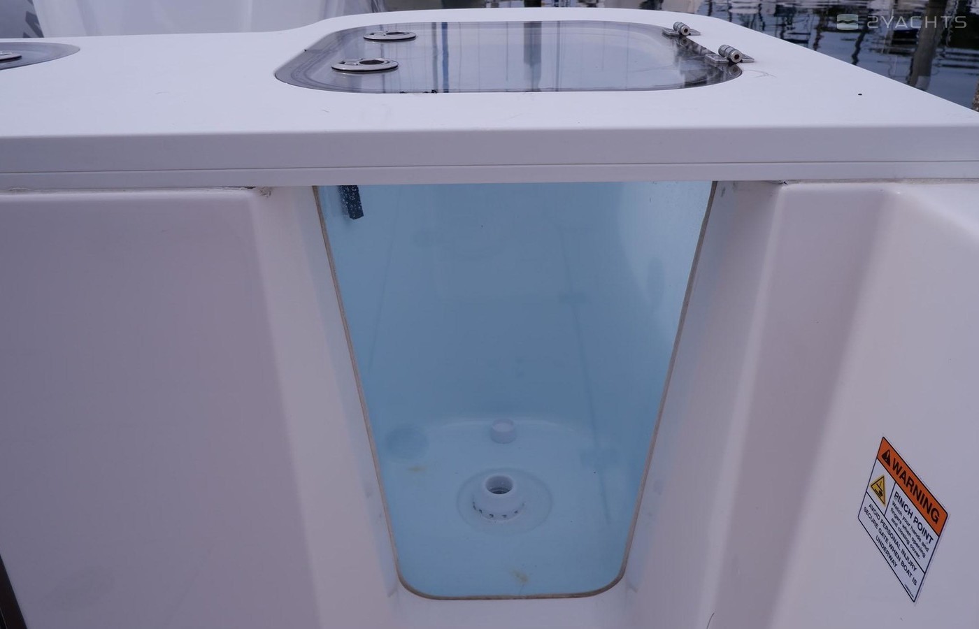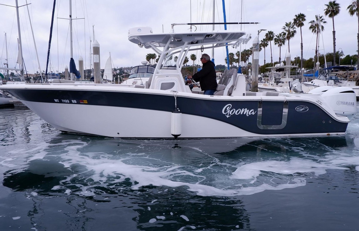 Standard Features· 28 12-volt power point · Anchor - windlass system w/controls at helm & bow switch · Anchor compartment w/anchor roller chute, chaff plate, safety strap & rope access · Battery switch · Bilge pumps - automatic (1100 GPH) (1 primary & 1 back up) · Boot stripe (silver) (only available on White Pearl hull) · Bulkhead fittings for hydraulic hoses (splashwell) · Cockpit - self bailing w/SST grates · Cockpit - side door access w/SST frame · Composite hull & deck · Console - black acrylic face · Console - coffin box/lounger w/armrests (40") · Console - compass · Console - dash shroud · Console - dash space for flush electronics (compatible for (2) 12" displays) · Console - dash "SF" backlit logo · Console - door (lockable) w/magnetic bottle opener · Console - finished interior & fiberglass inner liner · Console - footrest/storage insert · Console - full digital gauge instrumentation (single multifunction digital gauges, tachometer, speedometer, volt, fuel, fuel management, backlight & push button functions (for XCA twin motors) · Console - horn · Console - portlight (2) · Console - sink w/Corian countertop · Cooler - 65-qt Yeti w/ mechanical slide-out · Cup holders (14) · Fish boxes - insulated in floor w/overboard discharge (2) · Fuel/water separators · Gel coat - Isothalic & vinylester barrier coat (hull & deck) · Jump seats - w/below deck storage (1) (flip up) (cockpit) · Lights - courtesy (LED) (2) · Lights - live well lights