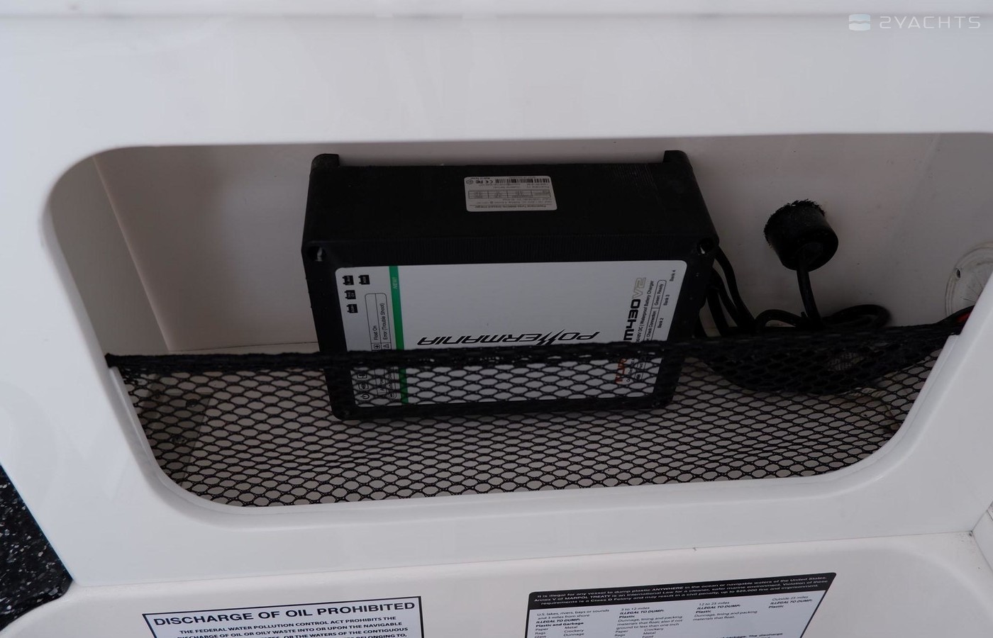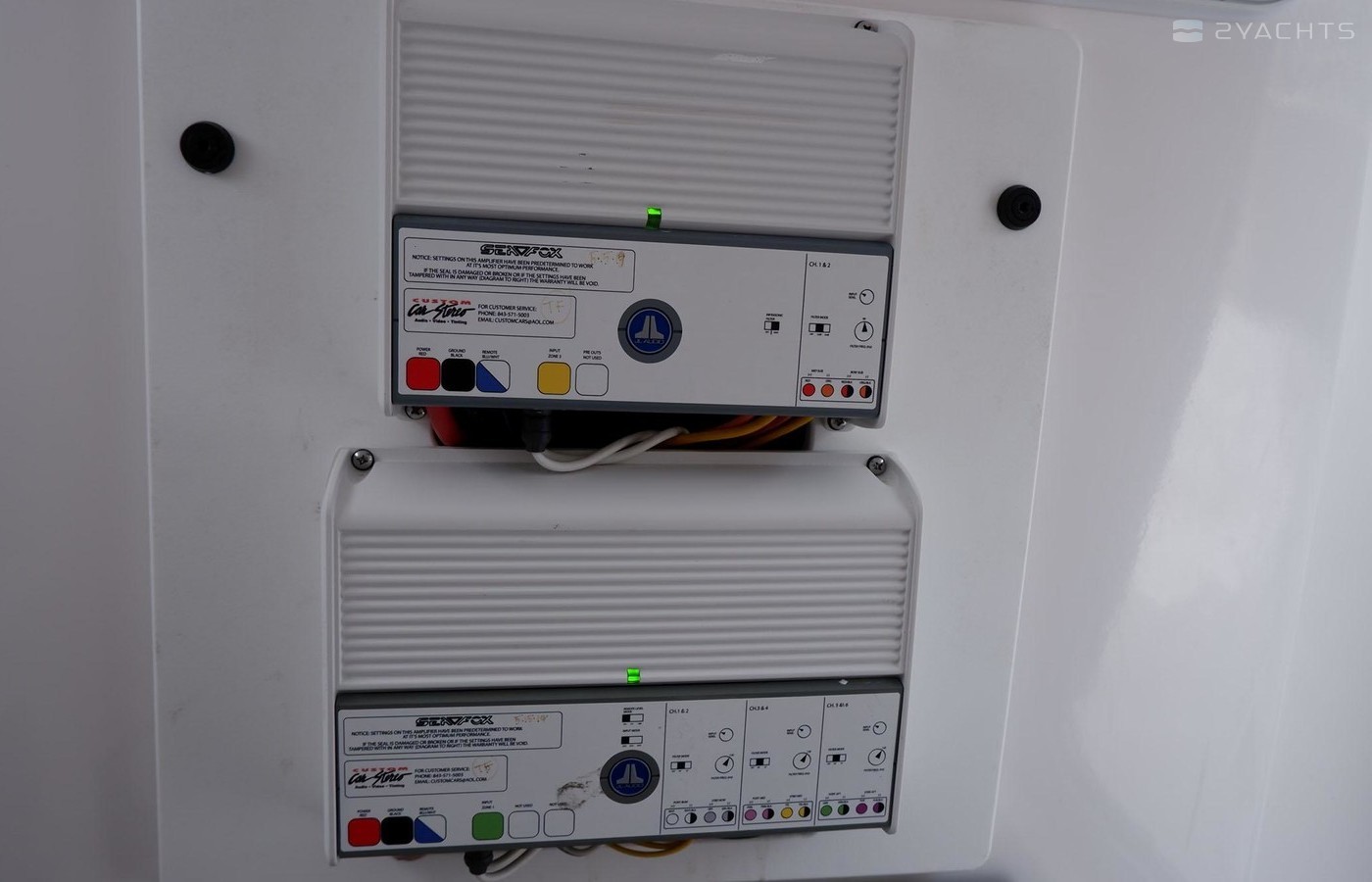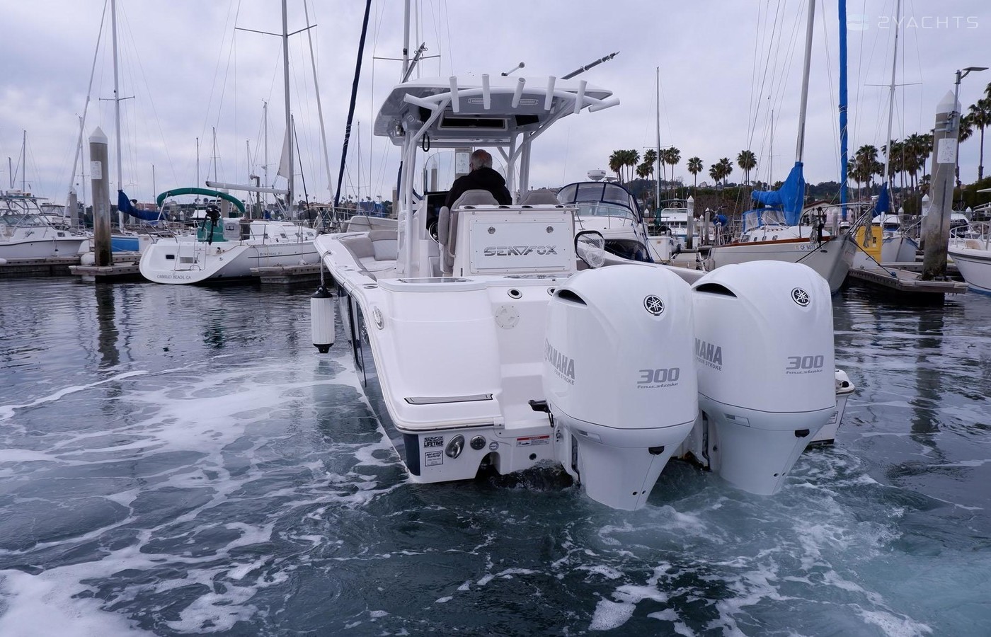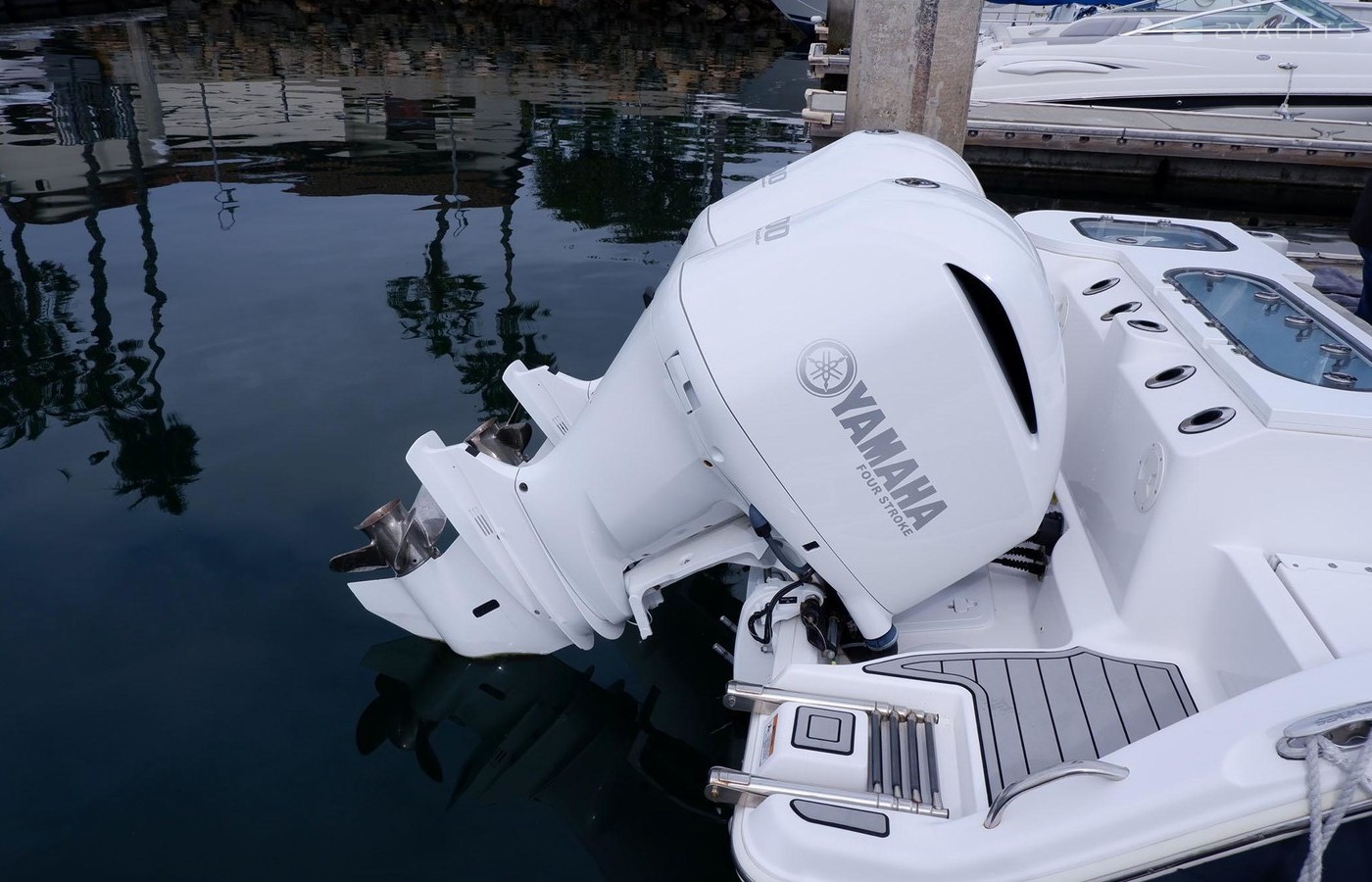 Standard Features· 28 12-volt power point · Anchor - windlass system w/controls at helm & bow switch · Anchor compartment w/anchor roller chute, chaff plate, safety strap & rope access · Battery switch · Bilge pumps - automatic (1100 GPH) (1 primary & 1 back up) · Boot stripe (silver) (only available on White Pearl hull) · Bulkhead fittings for hydraulic hoses (splashwell) · Cockpit - self bailing w/SST grates · Cockpit - side door access w/SST frame · Composite hull & deck · Console - black acrylic face · Console - coffin box/lounger w/armrests (40") · Console - compass · Console - dash shroud · Console - dash space for flush electronics (compatible for (2) 12" displays) · Console - dash "SF" backlit logo · Console - door (lockable) w/magnetic bottle opener · Console - finished interior & fiberglass inner liner · Console - footrest/storage insert · Console - full digital gauge instrumentation (single multifunction digital gauges, tachometer, speedometer, volt, fuel, fuel management, backlight & push button functions (for XCA twin motors) · Console - horn · Console - portlight (2) · Console - sink w/Corian countertop · Cooler - 65-qt Yeti w/ mechanical slide-out · Cup holders (14) · Fish boxes - insulated in floor w/overboard discharge (2) · Fuel/water separators · Gel coat - Isothalic & vinylester barrier coat (hull & deck) · Jump seats - w/below deck storage (1) (flip up) (cockpit) · Lights - courtesy (LED) (2) · Lights - live well lights