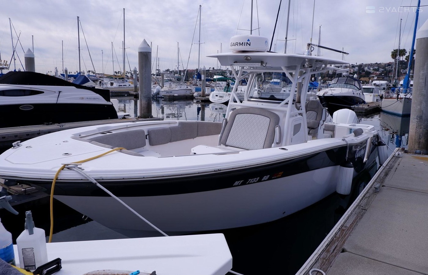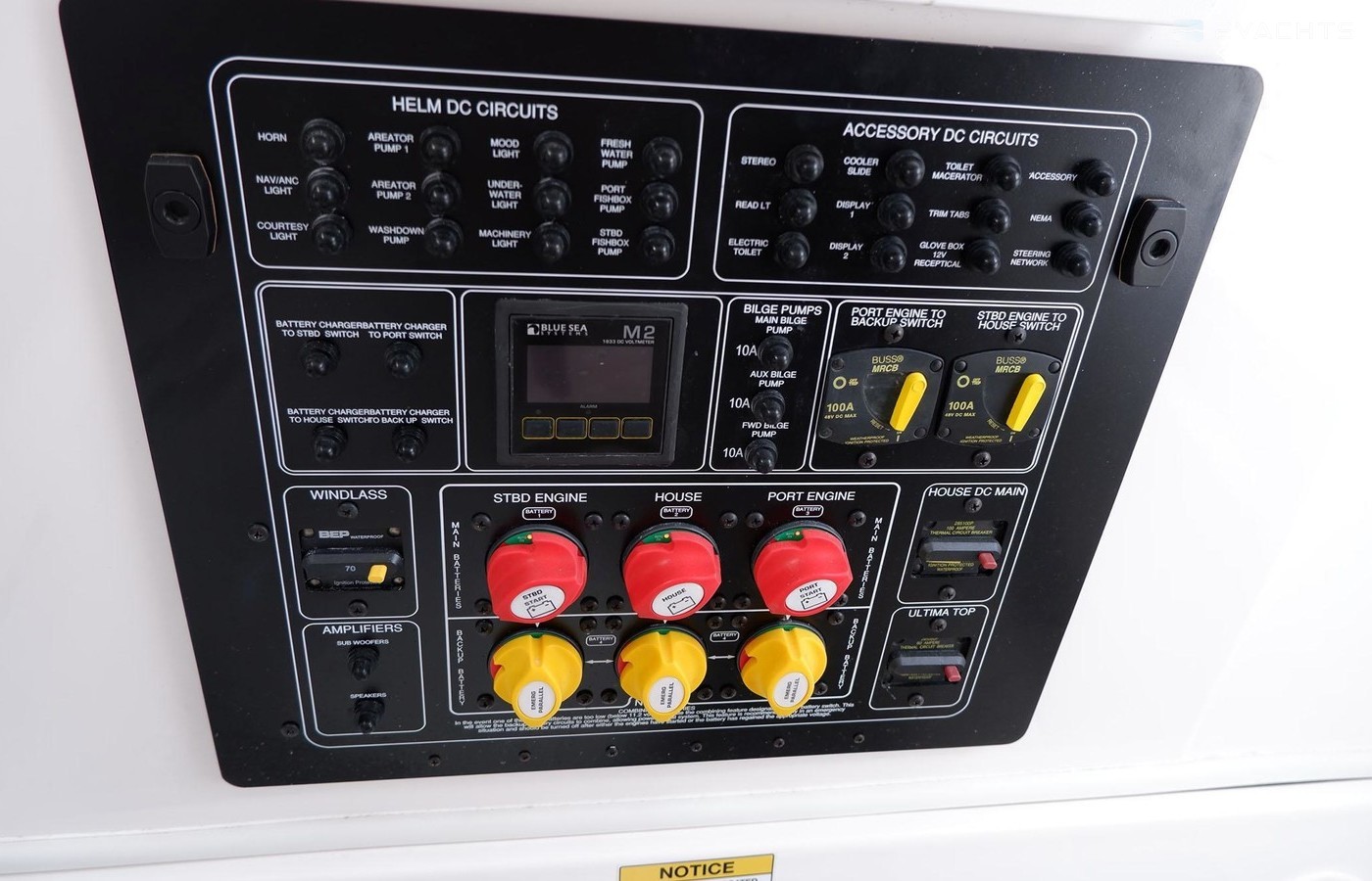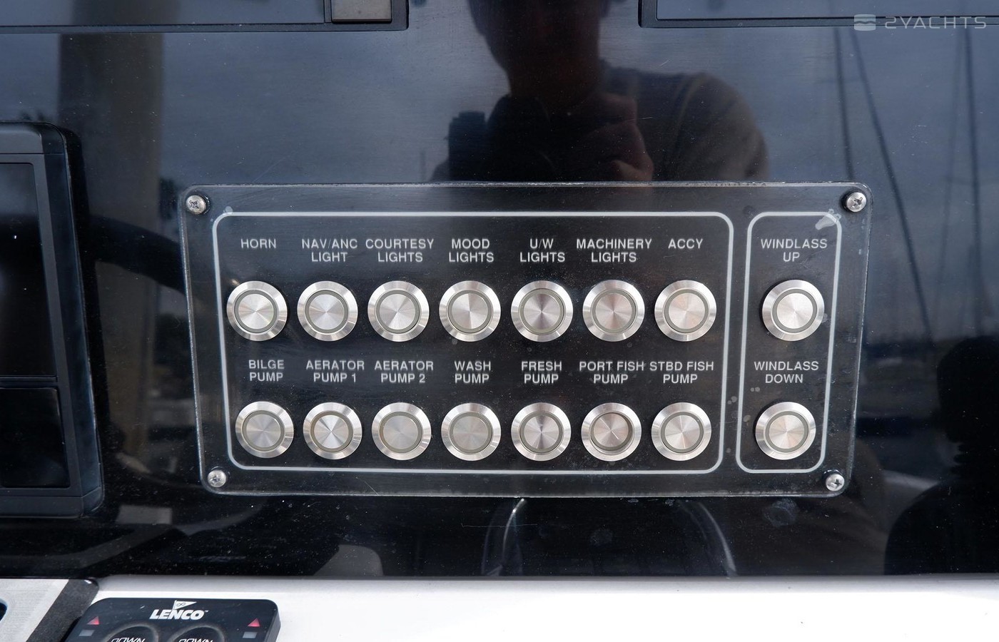 · Lights - navigation (rub rail mount) (LED) · Live well - 1100 GPH aerated (60 gallons; pressurized) · Live well - aquarium window · Prerig for 3 batteries (twin engines) · Pump house compartment - cockpit floor · Rod storage - gunwale · Sand-grip deck surface · SST Closeout rings for rod holders · SST fasteners · SST latches (compression) · SST pull-up cleats (6) · SST rear boarding telescopic ladder · SST recessed grab rail at bow · SST rod holders (8) · SST rub rail · SST steering wheel w/turning knob · SST through hulls · SST through-bolted gran rails · SST transom saver · Steering - SeaStar electronic power steering (EPS) (tilt) · Storage - floor w/5-gallon bucket · Storage/fish box - bow · Toilet - electric w/holding tank (12 gallons) · Trim tabs - standard switch (recessed) · Ultima hard top - recessed LED spreader lights (2), molded-in storage box (2), safety storage box forward (1), JL Audio stereo w/USB/MPS connector, (2) 10" subwoofers, (6) 7.7" speakers & 2 amplifiers, LED lights (2) - red, blue & white (power cycle), rod holders (7), illuminated switch panel, safety storage box (forward), moonroof w/slide open glass, reinforced pads for dual antennas & Garmin radar · Upholstery - bench seat (folding) (rear) · Upholstery - bow backrests (fold out) (2) · Upholstery - bow cushions w/curved backrests · Upholstery - coaming pads · Upholstery - faux teak decking · Upholstery - marine grade vinyl w/diamond stitch · Warranty - Limited Lifetime (hull) · Washdown - fresh water w/26-gallon tank · Washdown - raw water · Windshield - glass