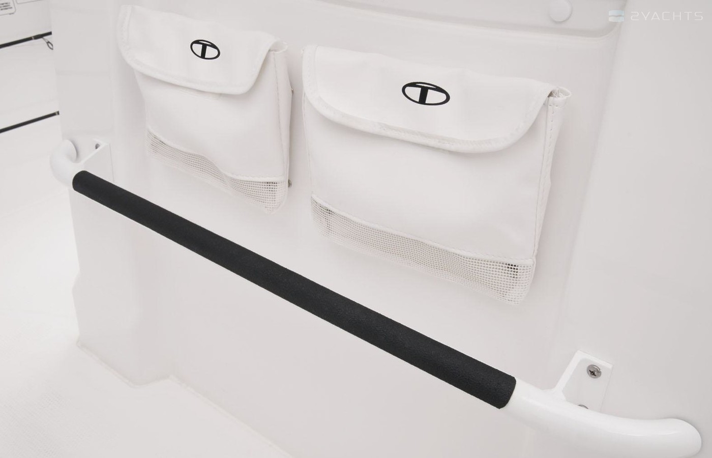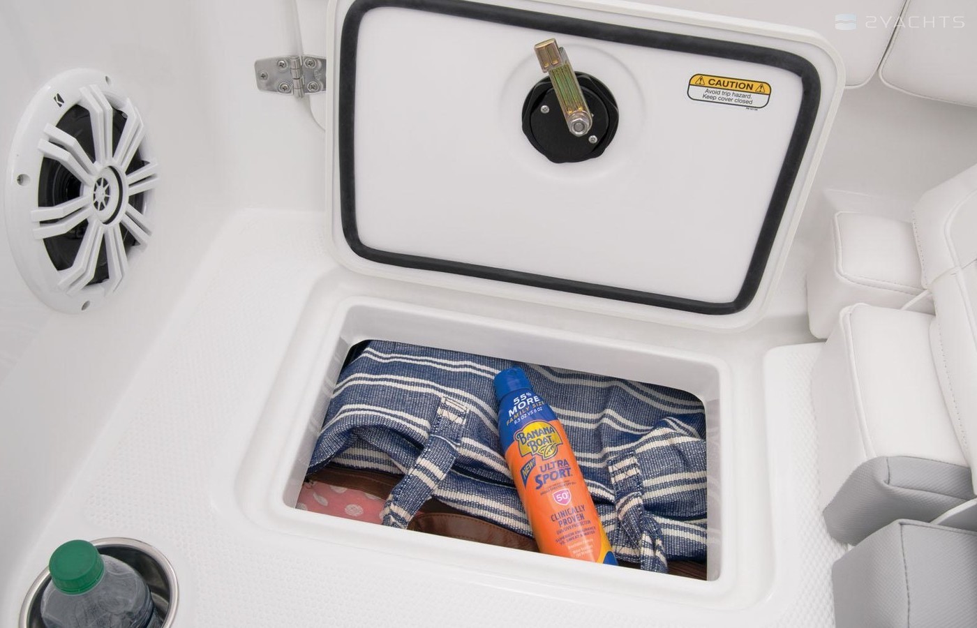• Front-access, in-console storage compartment w/room for optional portable toilet (works w/drop-down Bimini top curtain)