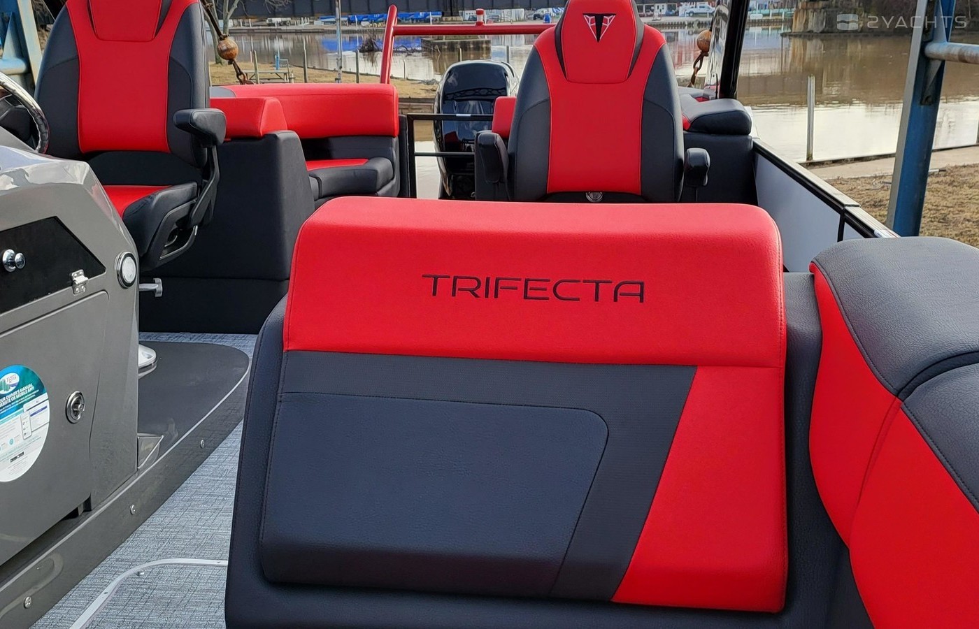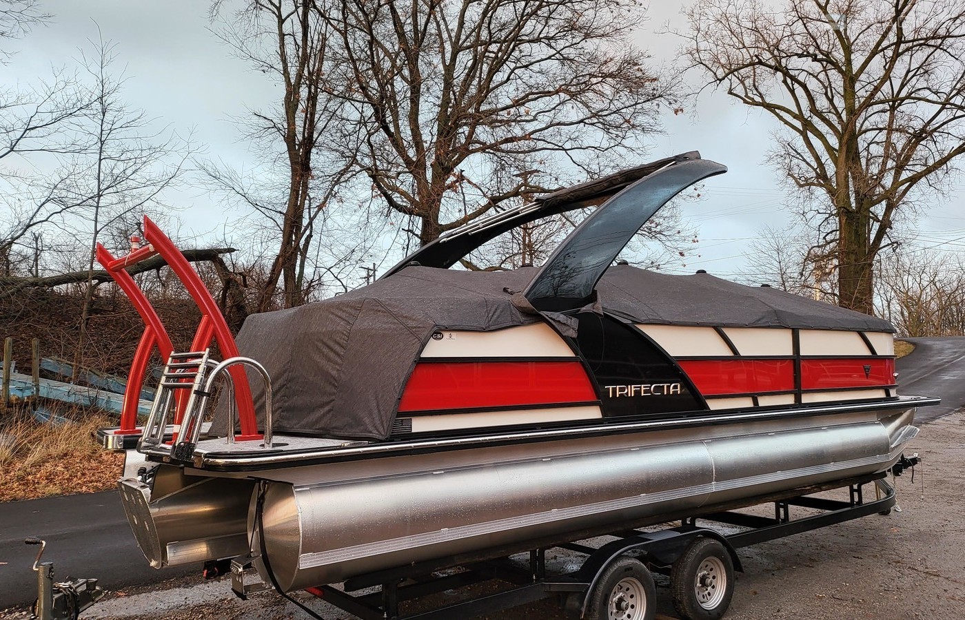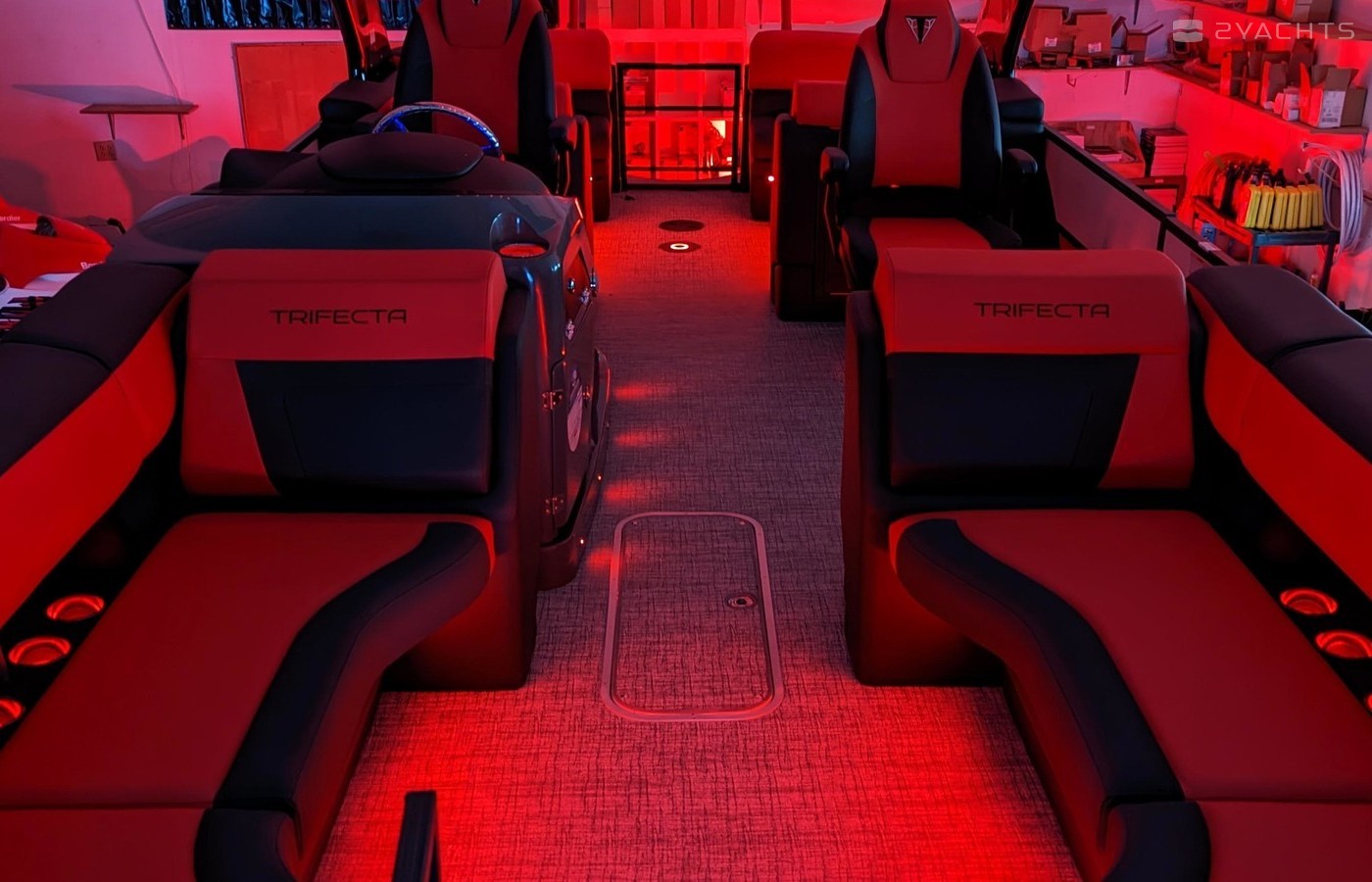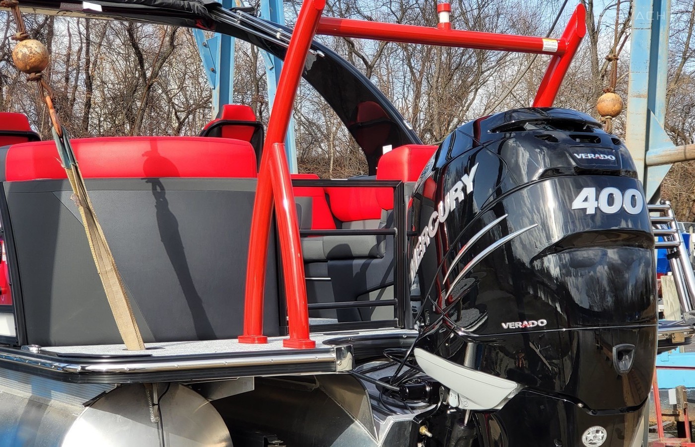 Trifecta the ultimate performance tritoon, and for a limited time with a 7 year warranty on boat and 400HP VERADO motor. Lifetime on the composite floor and tube welded structure. A spectacular red, black, and white color scheme gives this boat a show-stopping appearance that we love. This is our favorite color scheme for good reason. Nothing comes together like red, white, and black. The LED's all over the boat give it a simply awesome look at nighttime. You can choose from any color but obviously you should leave the red on at full power as often as possible. Comes with a brand new 400 HP Verado from Mercury, giving it ample power to throw you back in your seat. You will be able to feel that this is the same hull as the world's fastest production tritoon. The industry leading 3.0+ performance hull enables maximum efficiency, smooth ride through chop, and incredibly sharp cornering abilities. Driving these out on Lake Erie is our family's favorite pastime. Take a ride and see for yourself why so many people have made the switch to tritoons. Contact us today to schedule a visit &/or test drive.