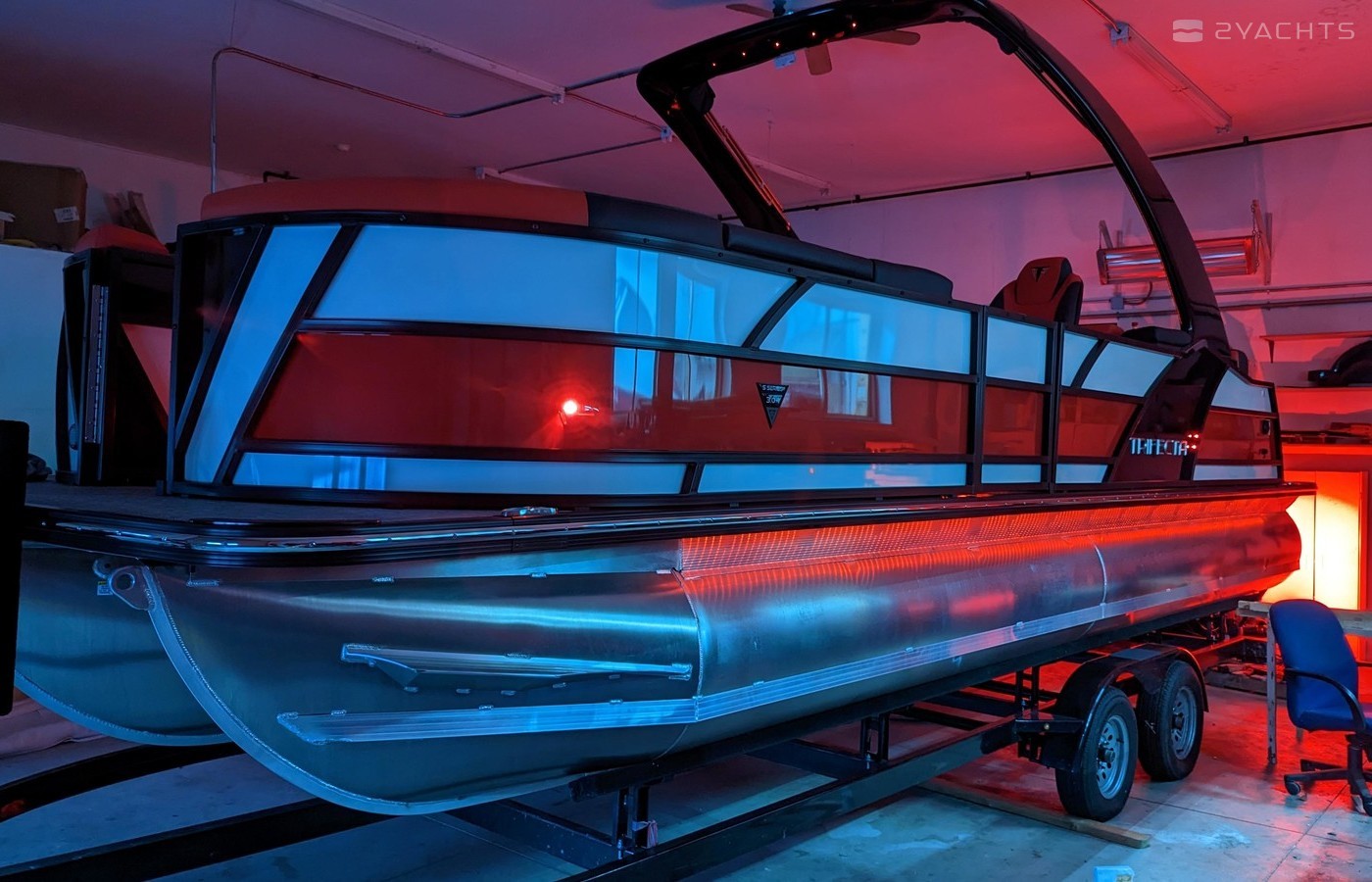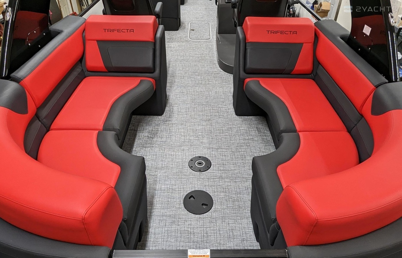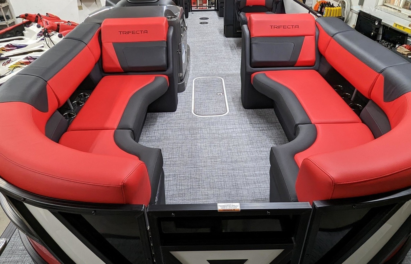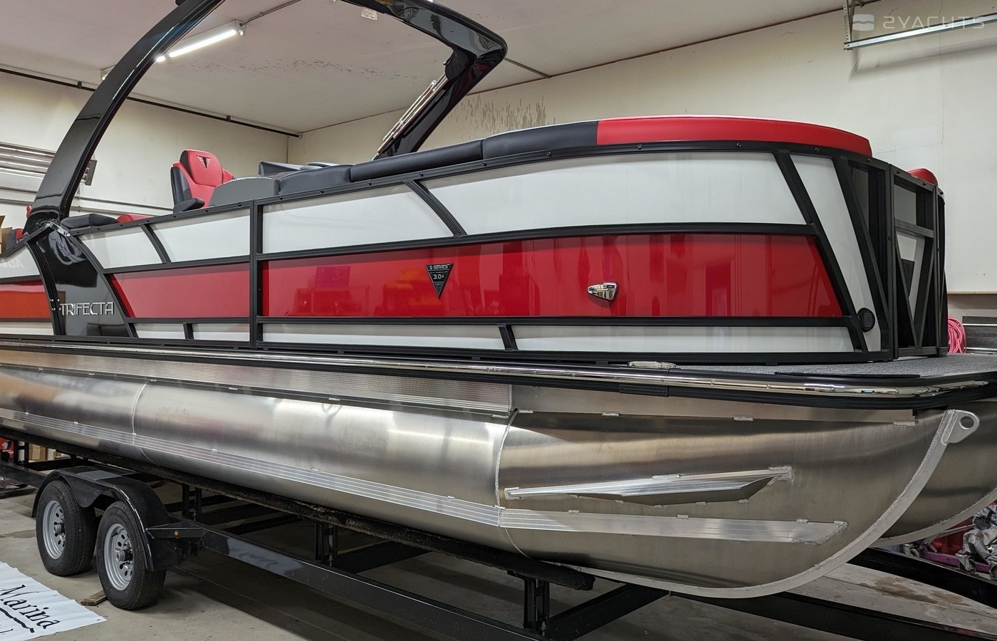 Trifecta the ultimate performance tritoon, and for a limited time with a 7 year warranty on boat and 400HP VERADO motor. Lifetime on the composite floor and tube welded structure. A spectacular red, black, and white color scheme gives this boat a show-stopping appearance that we love. This is our favorite color scheme for good reason. Nothing comes together like red, white, and black. The LED's all over the boat give it a simply awesome look at nighttime. You can choose from any color but obviously you should leave the red on at full power as often as possible. Comes with a brand new 400 HP Verado from Mercury, giving it ample power to throw you back in your seat. You will be able to feel that this is the same hull as the world's fastest production tritoon. The industry leading 3.0+ performance hull enables maximum efficiency, smooth ride through chop, and incredibly sharp cornering abilities. Driving these out on Lake Erie is our family's favorite pastime. Take a ride and see for yourself why so many people have made the switch to tritoons. Contact us today to schedule a visit &/or test drive.