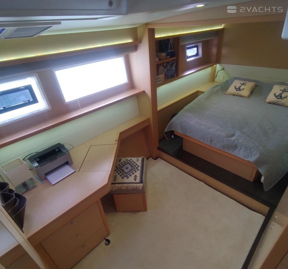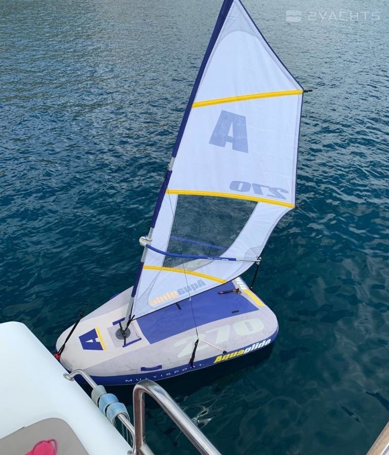 Mainsail (97 mq), Genoa (59 mq), Gennaker equipment, Jib Furling System, Bowsprit, Lazy Bag, Lazy Jack, Mainsheet traveller.