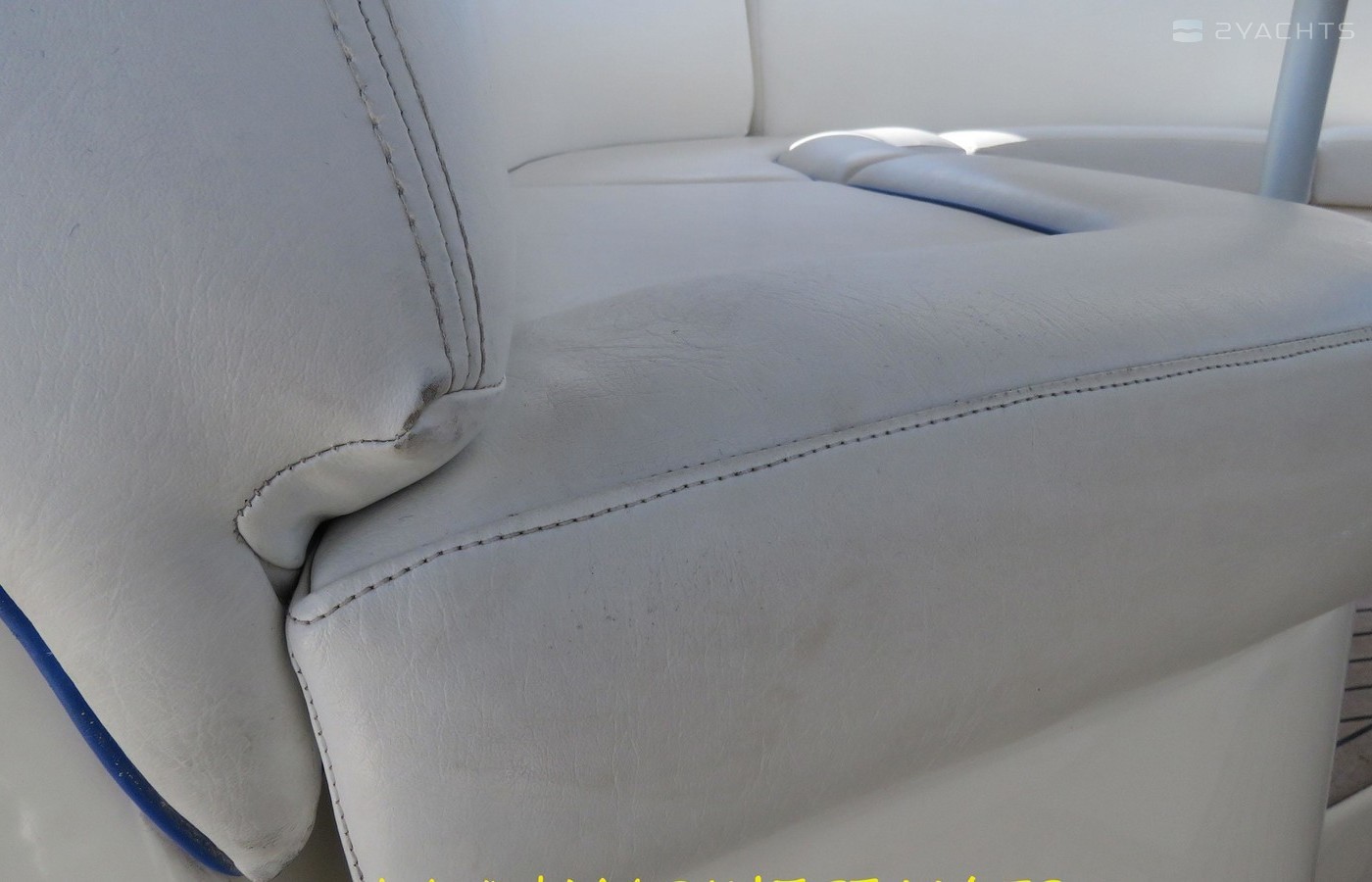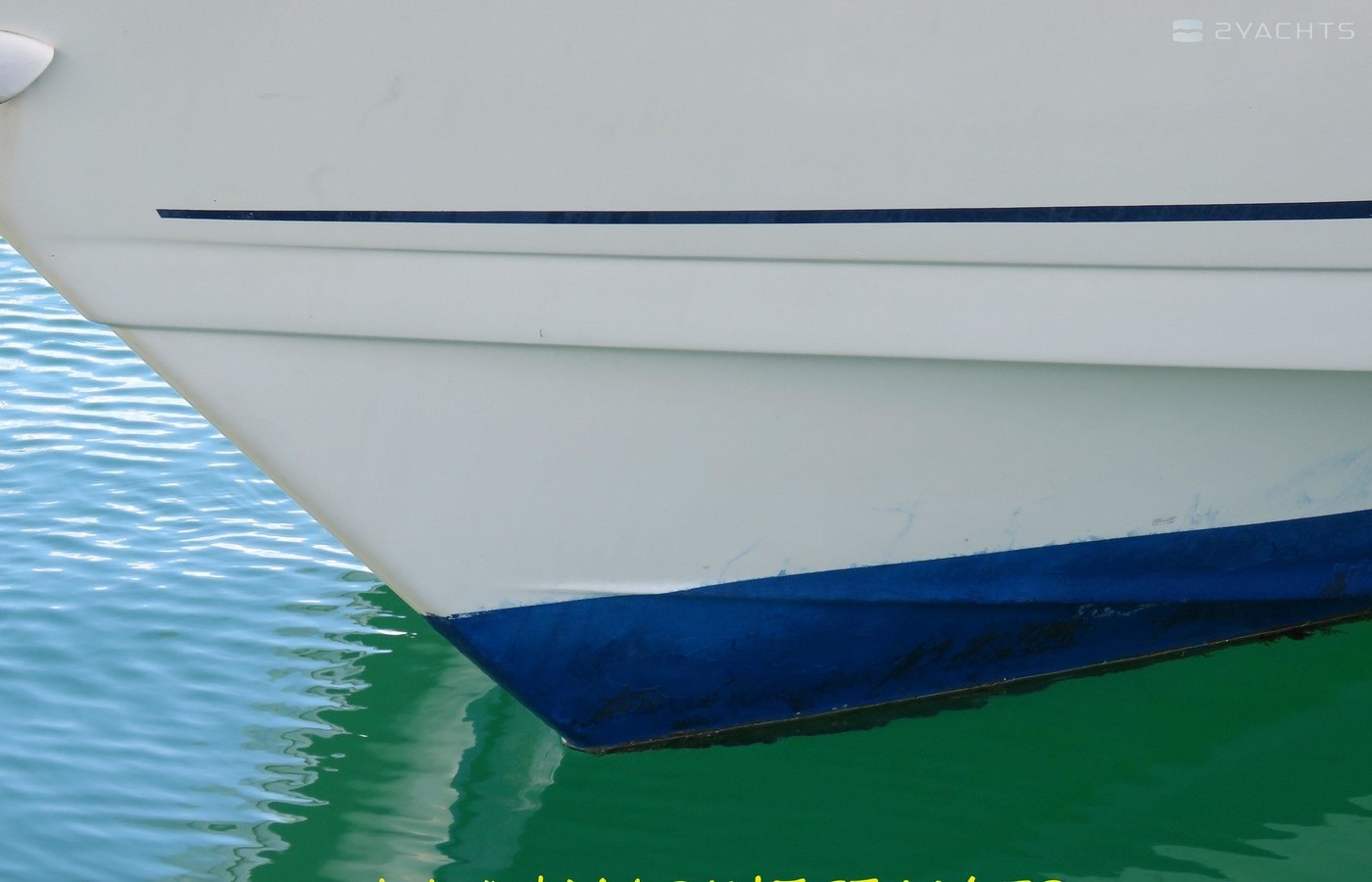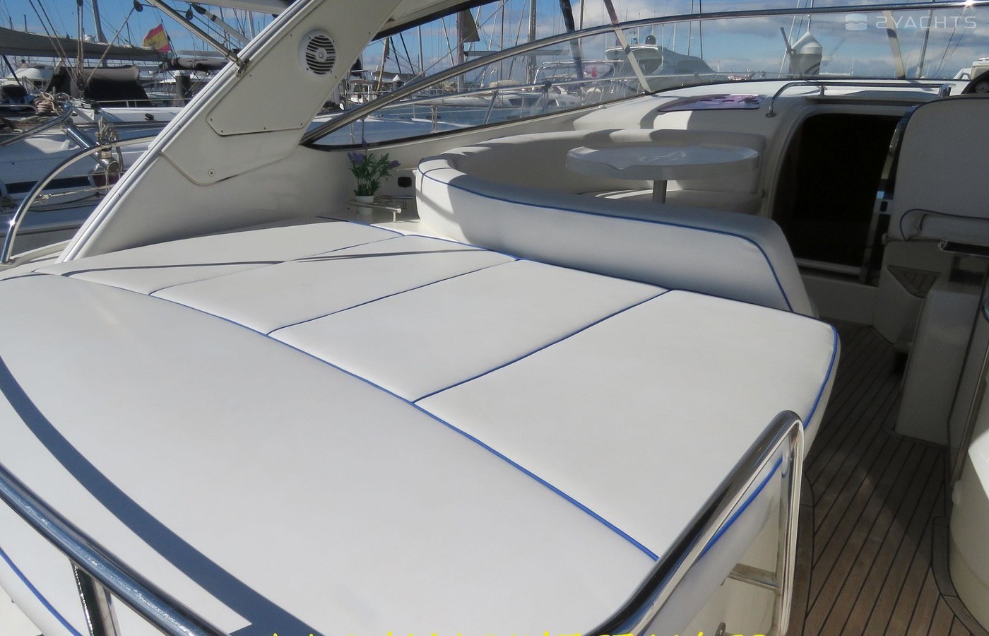 Swim platform with folding wooden step. Electric aft garage. Wide corridors to forward. Forward sun pad. Aft sun pad. Cockpit saloon with U-shaped sofa, equipped wet bar and dinette. Helm station with bolster seat.