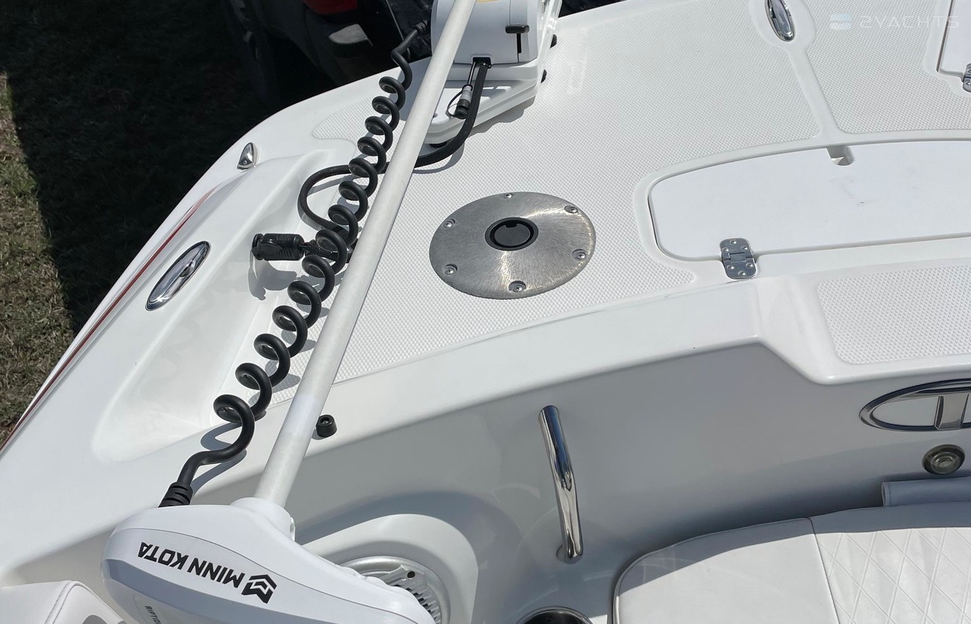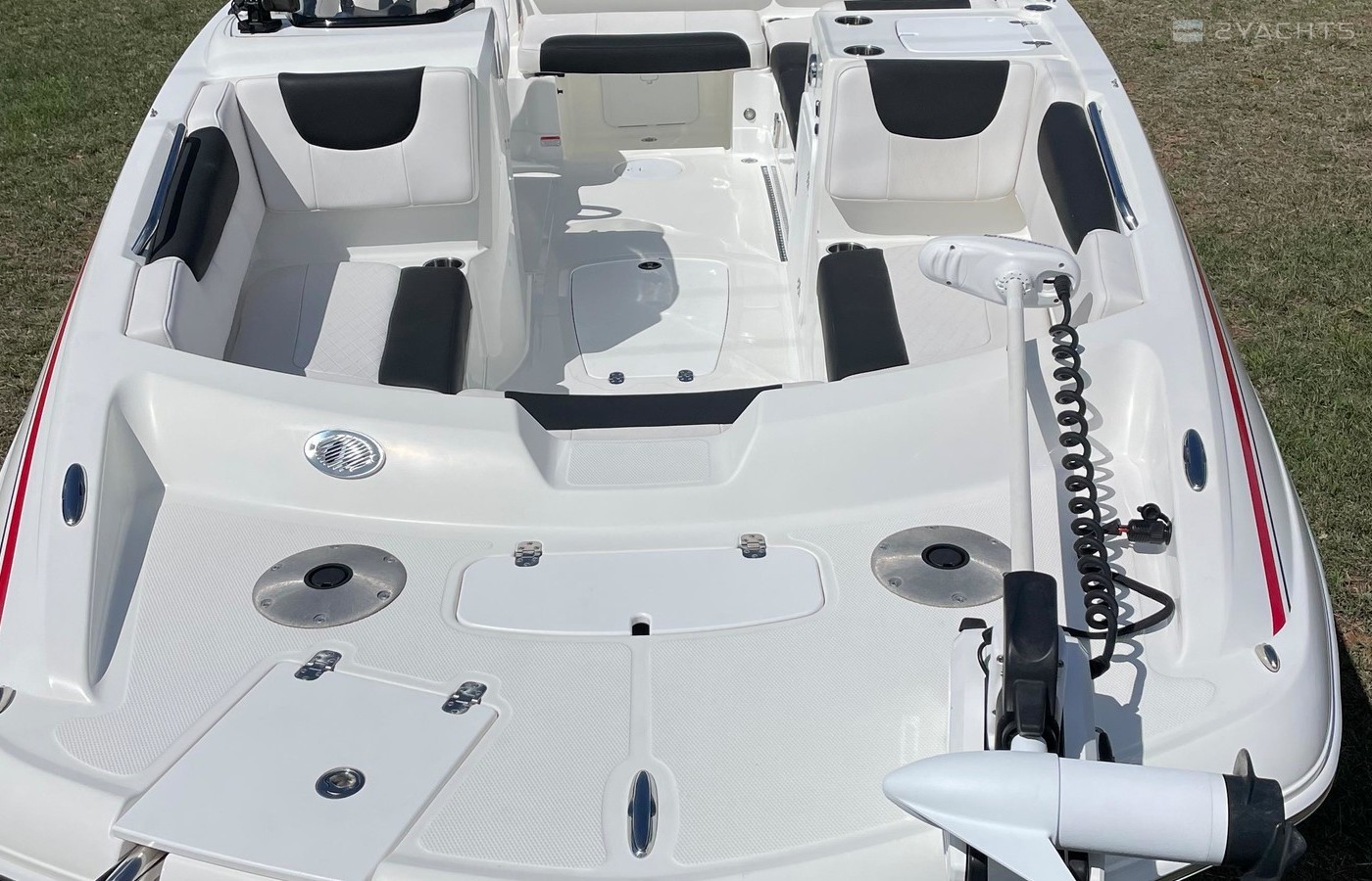 Fishing package w/MotorGuide® Xi3 24V, 70-lb. (31.8 kg) thrust, 60" (1.52 m) shaft trolling motor; Lowrance® HOOK2 5x fishfinder; trolling battery charger; 2 fishing seats w/pedestals & bags; 2 rod holders; & 2 tackle trays w/dedicated storage. Changing curtain in Bimini top