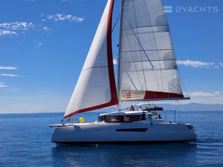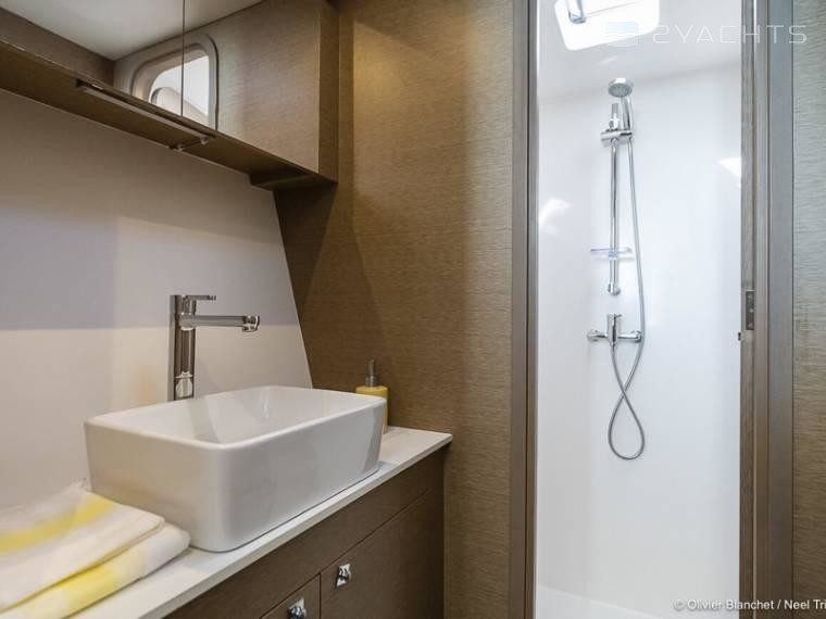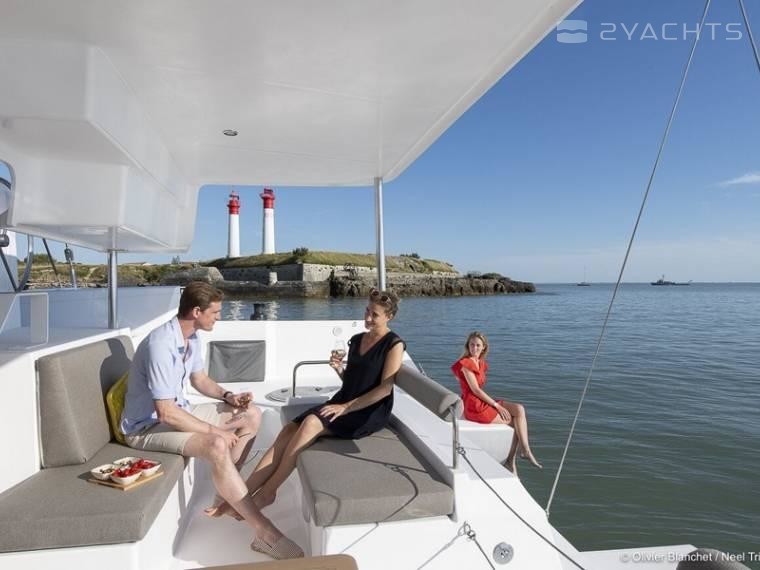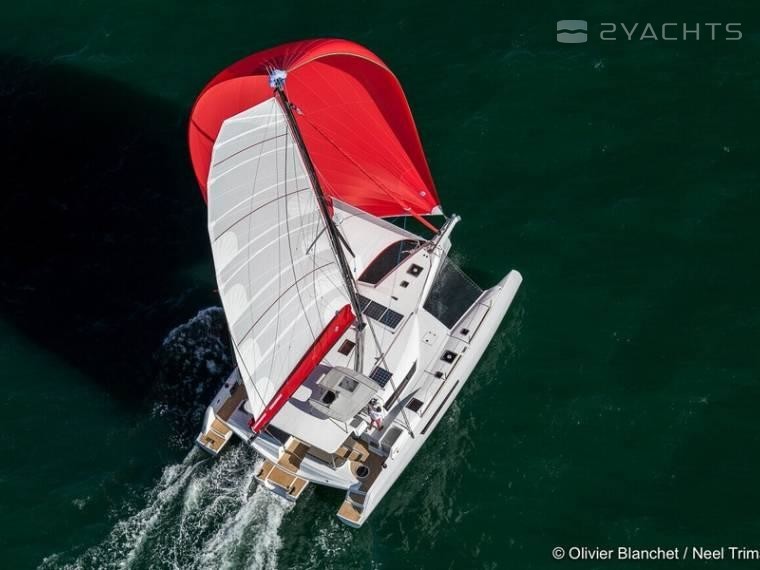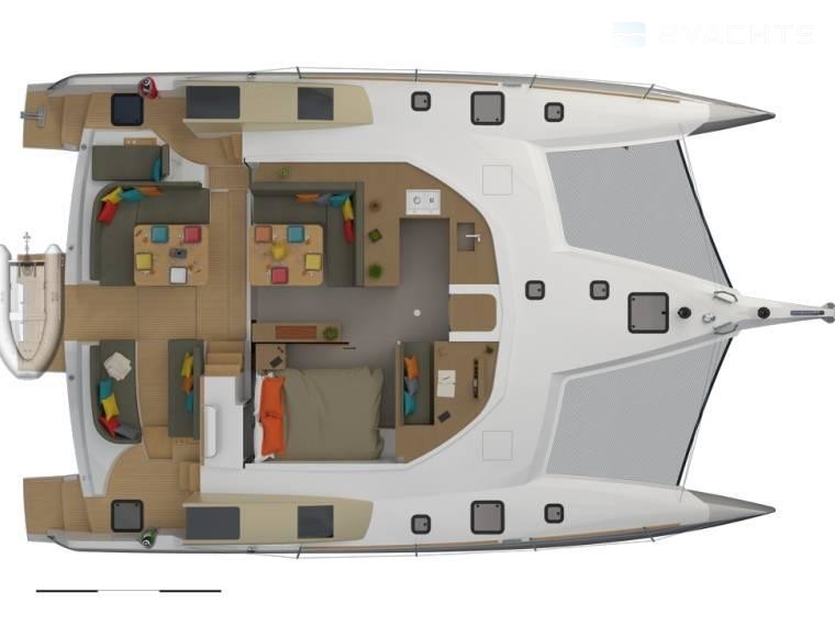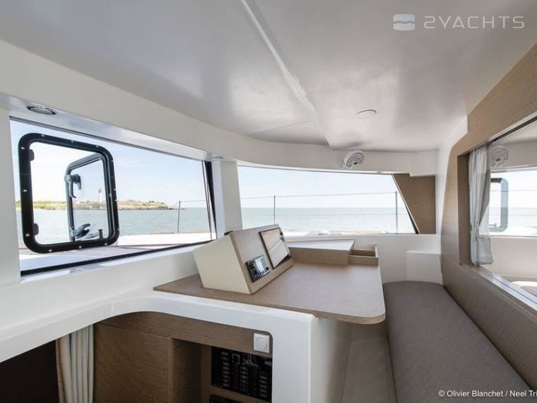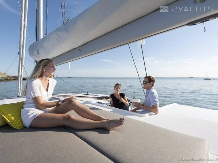 Cockpit ? Vaste cockpit Full Beam de plein pied avec le COKLOON d?une part et d?un salon de pont d?autre part ? Ensemble abrite par un toit rigide ? Sellerie cockpit ? Fond de cockpit en gel coat avec antiderapant pointe de diamant Jupes flotteurs ? Plateforme de bains pour chaque jupe flotteur servant de quai d?embarquement pour annexe et d?acces lateral au catway ? Main courante Jupe coque centrale ? 2 marches d?acces a la mer ? Echelle de bain supplementaire avec douchette eau chaude/eau froide en option ? Bers de reception de l?annexe ? Emplacement pour le radeau de survie Poste de barre ? Acces par passavant tribord et depuis le cockpit ? Large banquette polyester ergonomique pour 2/3 personnes ? Barre a roue diametre 800 mm ? Console a instruments recevant compas, commande moteur, aide a la navigation (option) et commande du propulseur d?etrave (en option ou inclus dans la version Premium) Poste de man?uvres ergonomique ? Retour de l?ensemble des manoeuvres devant le poste de barre ? Rangement des drisses et ecoute dans des sacs a bouts dedies 8 chandeliers hauteur 600mm 2 rangees de filieres en Dynema phosphorescent