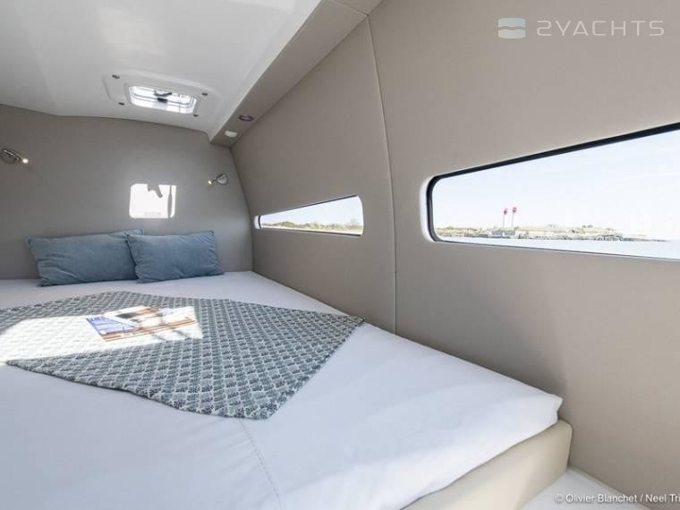 Menuiseries en Alpi Amenagements realises avec des materiaux biosources et recyclables, Tissus et revetements adaptes au milieu marin, lavable, resistant aux UV Cockloon? ? Veritable innovation permettant de loger jusqu?a 10 convives autour de deux tables formant un espace unique avec l?avantage de se situer dans une zone a la fois interieure mais aussi offrant une vue unique sur l?exterieur. ? Possibilite de moduler en deux zones distinctes table interieure et table exterieurs grace a la baie de fermeture elle-meme modulaire, selon les envies et les conditions climatiques Cabine de pont principal ? Acces de plein pied ? Vue unique sur l?horizon ? 1 armoires de rangement ? Rangements a tiroir sous le lit ? 1 lit double avec acces lateraux ? Eclairage LED, 2 liseuses, ? 1 prise 220V (inclus avec le pack essentiel) ? Rideaux d?occultation Espace de bien etre (coque centrale) ? 1/3 de la coque centrale est consacree a un immense espace de confort de vie rassemblant 4 fonctions independantes : ? Dressing : Meuble accueillant penderies, tiroirs et etageres. Ideales pour la vie longue duree a bord. ? Espace coiffeuse, lavabo independant avec miroir de plain-pied, equipets et rangements, ? Douche XXL independante : largeur : 0,90 m longueur (mesure au sol) : 1,20 m avec pare-douche de penderie, ? Compartiment WC independant Suites invite flotteurs ? Dome d?entree privatif direct le cockpit ? Sas d?entree avec pateres et lavabo (WC sous l?escalier amovible en option) ? Large hulot de borde offrant lumiere et vue unique sur l?horizon ? Armoire penderie et equipets de rangement ? Rangements sous le lit ? 1 lit double 130 x 200 ? Eclairage LED, 2 liseuses, 1 prise 220V ? Rideaux d?occultation ? Eclairage LED ? 1 Prise 220 V (inclus dans le pack essentiel) Espace bureau table a carte ? Vue panoramique a 220?, dans le sens de la marche. ? Grand bureau table a carte abattant ? Equipet de rangement ? Banquette double de veille avec trappe de rangement ? 2 Prises 220v sur convertisseur 2 000 W (pack essentiel) ? Liseuse orientable ? Tableau electrique et controle des equipements embarques dans coffret lateral ? Console disponible pour electronique de navigation Sun deck ? Acces depuis le poste de manoeuvre par trois marches ? Matelas Solarium longueur= 2m x largeur =1.50m en option. Non utilisable en navigation. (en option : pack premium ) 4eme et 5eme cabines (option) ? Amenagement avec matelas 110x200, equipets de rangement ? Starter room avec dressing ? Vaigrages et revetements ? Liseuses ? Store moustiquaire/occultation