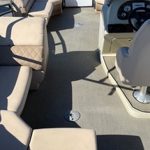 DetailsWe love the look of the soft touch high-end upholstery that includes a dark inlay pattern that carries over to all the furniture and seats onboard. At the helm the console is symmetrical with a Simrad GPS with white gauges on each side. Just right of the steering wheel are well-labeled rocker switches and on the other side is access to the JBL stereo with a USB and auxiliary jack. To get to the console wiring there is a door below the steering wheel that makes it easy to work on. Worth noting, the wires were all well-bundled and chafe protected. Directly across from the helm is a rear-facing chaise lounge that is part of the L-shaped stern bench floorplan. From this point in the boat forward it’s all about entertaining and keeping the family happy. In the stern is a great fishing station that includes two folding fishing chairs, two rod holders and storage for up to four fishing rods. Plus, the aerated livewell is a nice touch, but one of our favorite features is the designated tackle storage. It would be nice if it had a lock, not so much for keeping lures from getting swiped but so your friends don’t know what you’re throwing when they’re being skunked. Speaking of casting a line, with the two stern gates next to the fishing chairs it would be really easy to open up these gates and comfortably fish off the back. Clearly this fishing layout was designed by engineers who know a thing or two about how anglers prefer to fish. There isn’t much of a swim deck as the majority of the boat is inside the rails, but there is just enough room for the three-step boarding ladder. Closer LookThere are lifting strakes on both sides of the center pontoon with a full length splash skin to complete the hull. Up top there is over 19 feet of usable deck space from inside the gates, and the rail height varies from over 25 inches tall to 33 inches on the sides. We found no fit and finish issues at all, but if we had to be picky from a cosmetic standpoint only, we’d prefer not to be able to see the rivets in the white interior panels. Higher-priced boats use different fastening methods so this really isn’t a big deal and the tradeoff is clearly the budget-friendly price. Throttle DownThe maximum horsepower rating on this particular model is 150 and that’s what was on the back. With the Suzuki 150 four-stroke she reached speeds in the mid 30s at full throttle while leaning slightly in the sharp turns. At the optimum cruising RPM of 2500 you could go around 74 miles with the 25-gallon fuel tank before fueling up.
