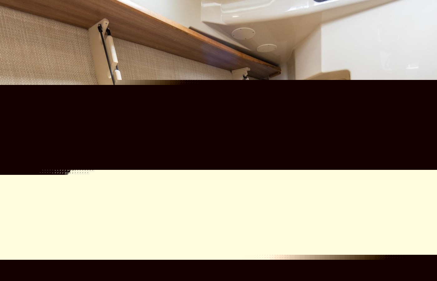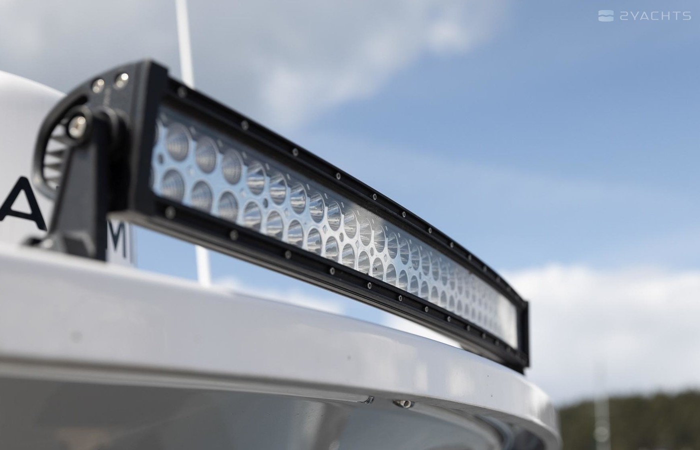 The cabin is a comfortable escape from the elements. Standard air conditioning and reverse cycle heating allow you to keep the interior at the perfect temperature. The large V-berth converts to lounge seating for additional entertaining space. In the cabin you’ll also find a Bluetooth equipped, multi-zone Fusion stereo system, refrigerator/freezer, LCD flatscreen, 110v outlets, rod storage and opening portlights. From the main cabin, you’ll find a fully enclosed head with an electric flush toilet and shower.