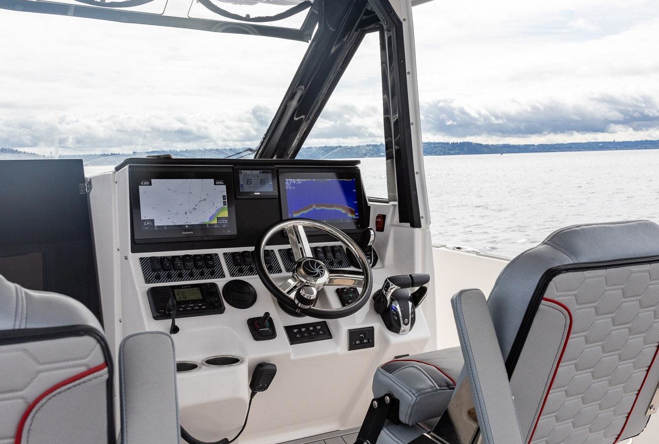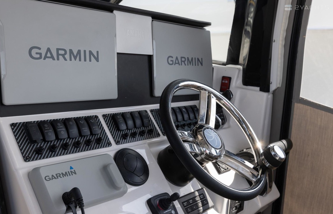 Standard at the helm you'll find dual Garmin 8612 chartplotters with fully customizable displays for complete confidence. Integrated bow and stern cameras, electronic throttle controls, docking lights, and a bow thruster that makes docking easier than ever. Additionally, the helm sports a Yamaha engine display with fuel flow, autopilot and tilt steering wheel.