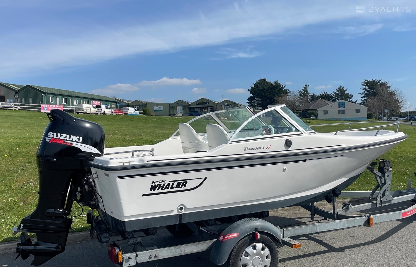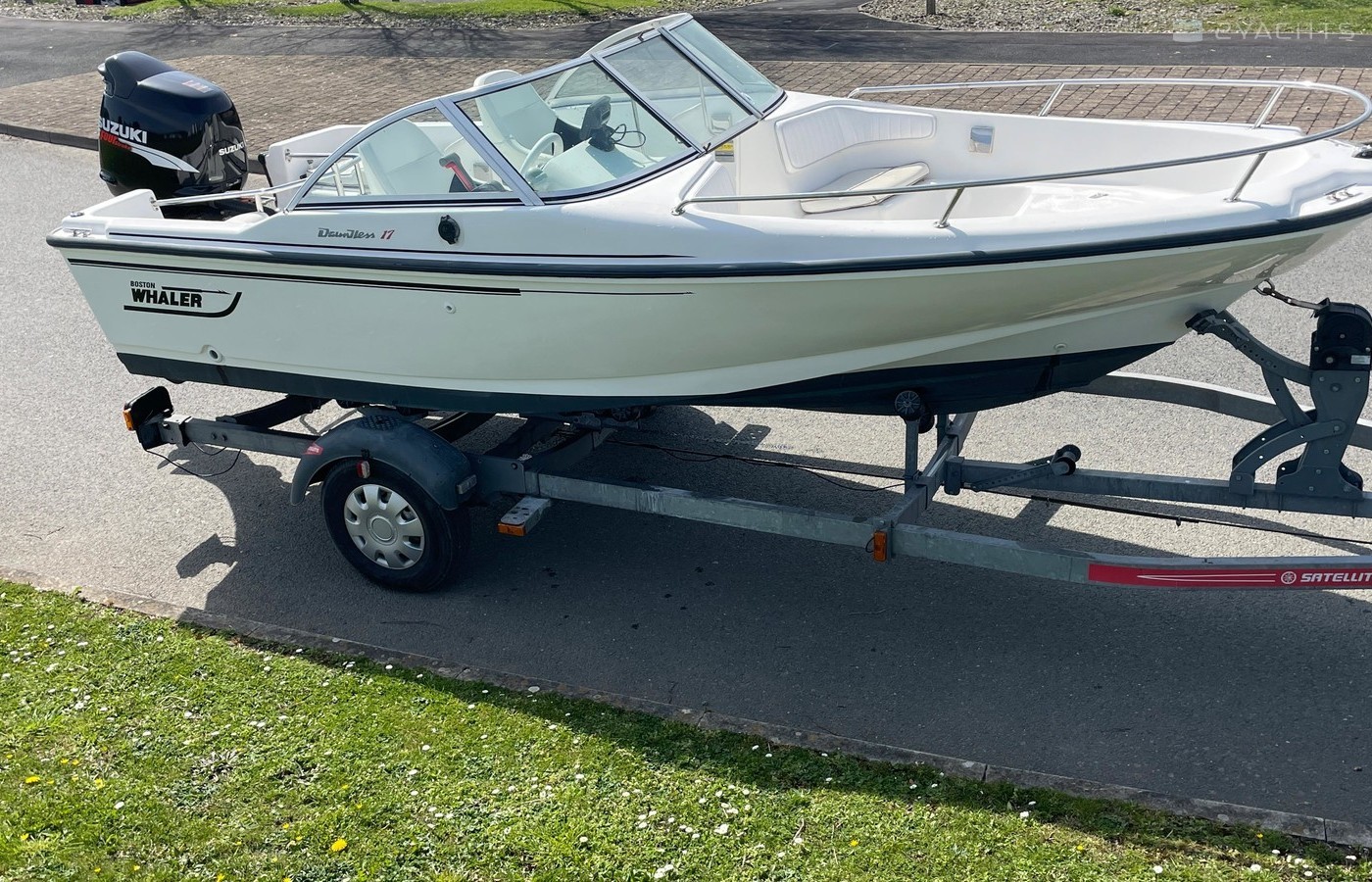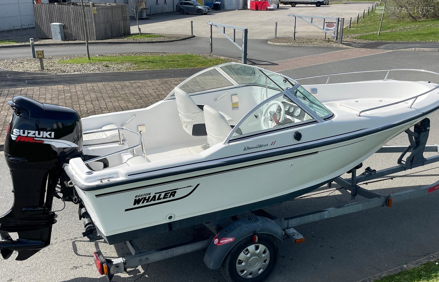 Nice condition 1998 Boston Whaler Dauntless 17 2004 Suzuki 140hp four stroke with only 250 hrs from new 2017 galvanised roller coaster trailer which is in excellent condition and has integral lights These boats have legendary status and are genuinely unsinkable. There are videos on the internet of them being sawn in half and still being driven. Lowrance Fishfinder. Icom hand held VHF The upholstery is in great condition for its age Stainless boarding ladder with small swim platform. National delivery can easily be arranged.