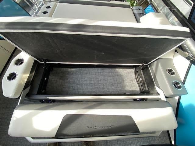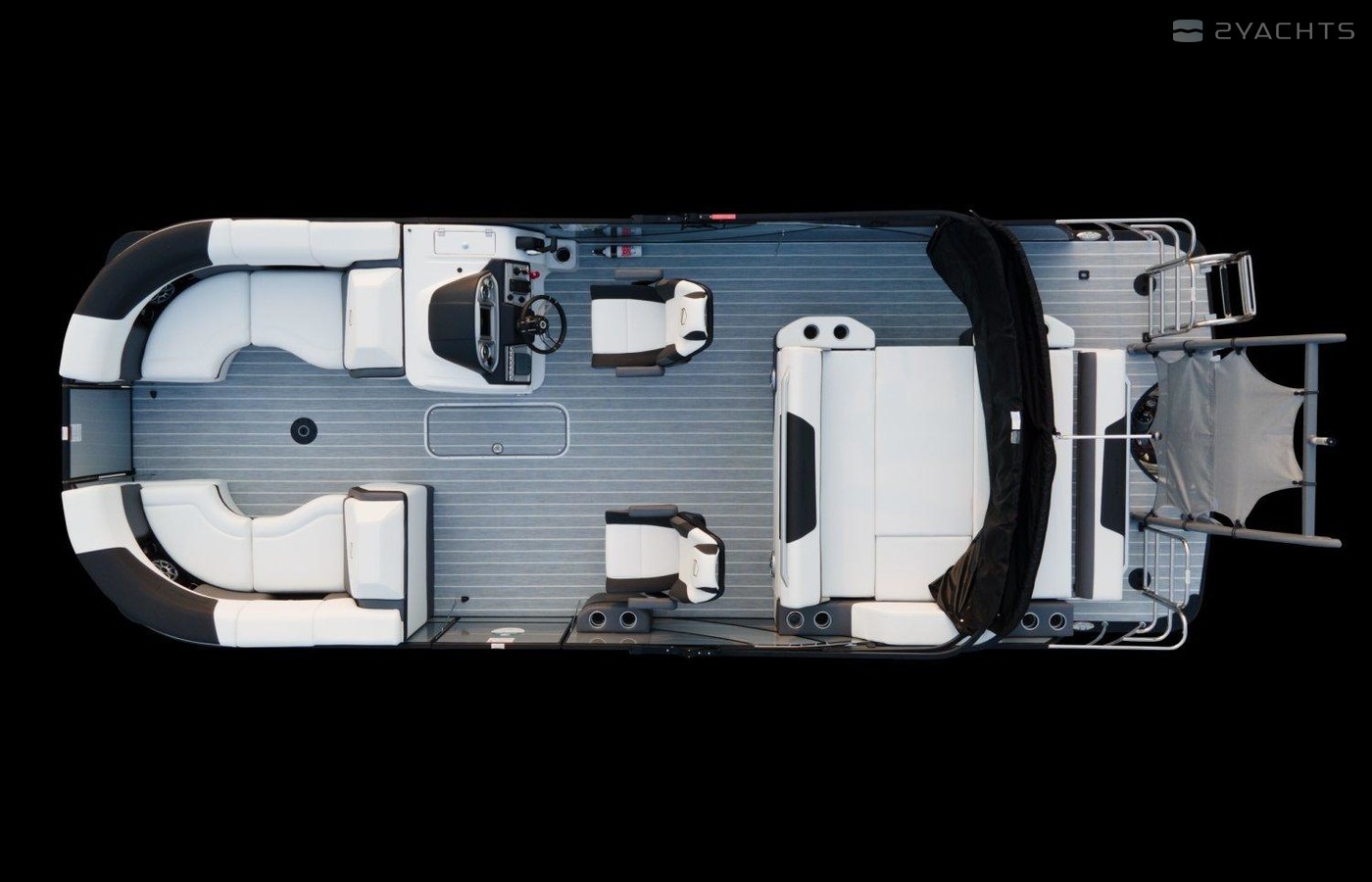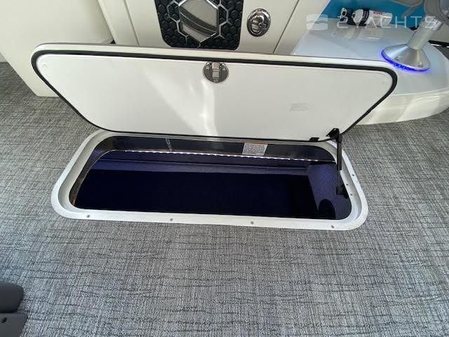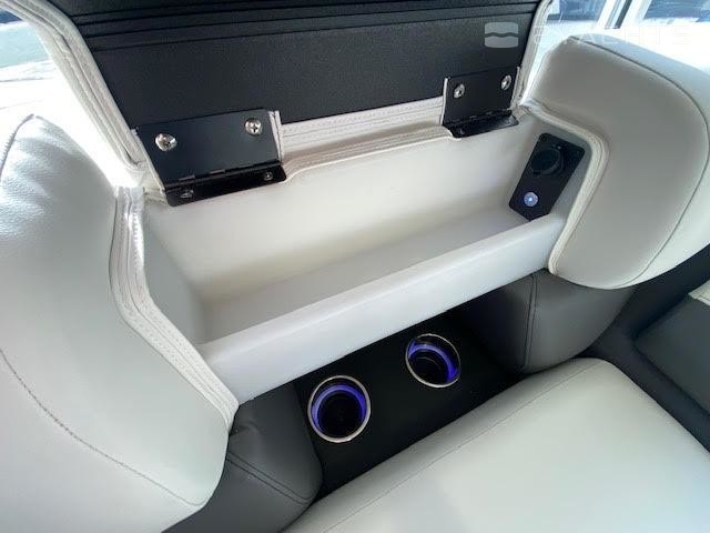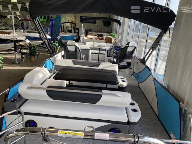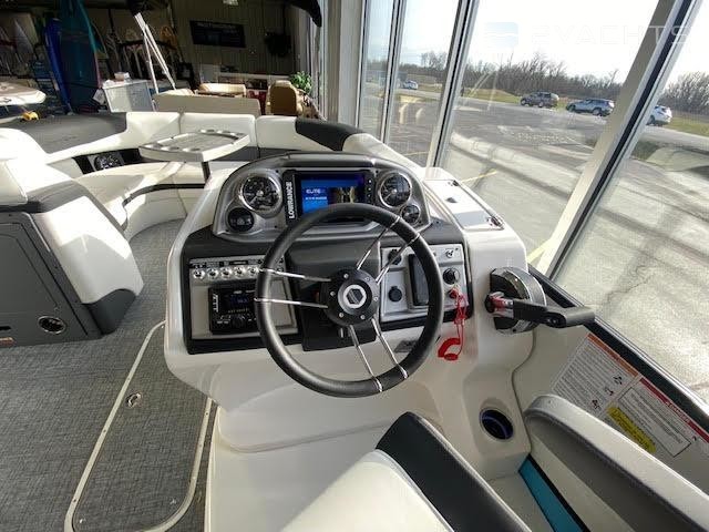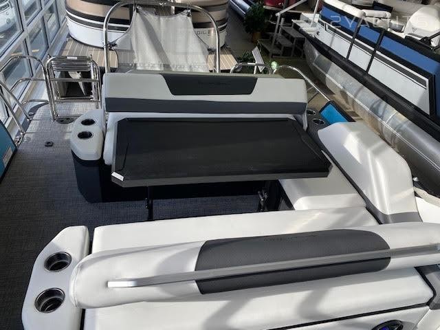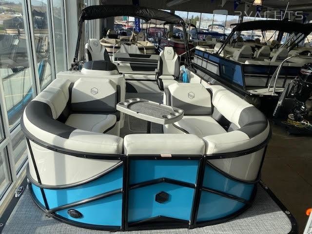 Black Out trim package TripletoonPearl white exterior panelAlpine smoke furnitureIn floor storageBlack canvasPower assist steering pumpHelm riserDeluxe table upgradeExpandable buffet24" bow benchRGB floor, table, exterior rail, cupholders and seat base lightsSS pop up bow/stern cleats