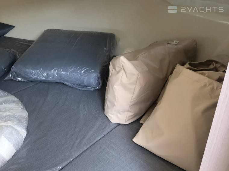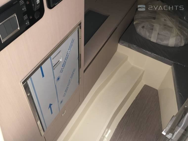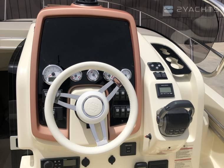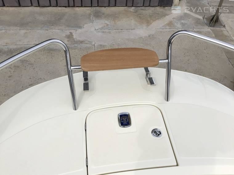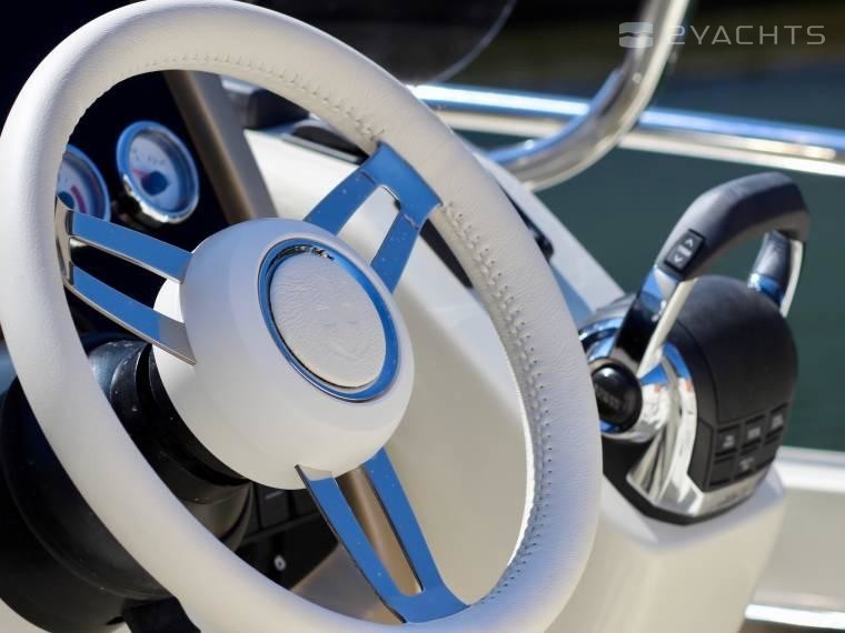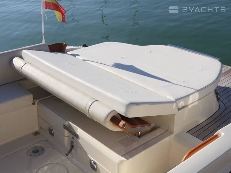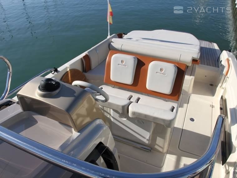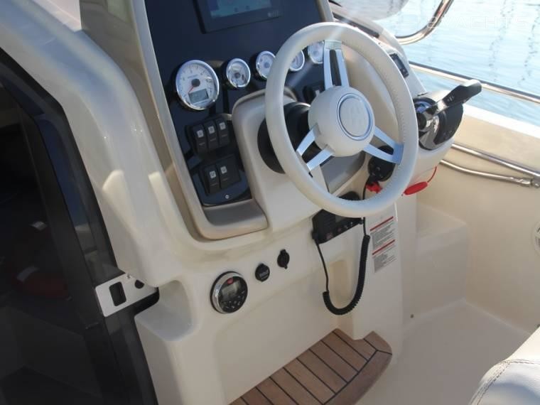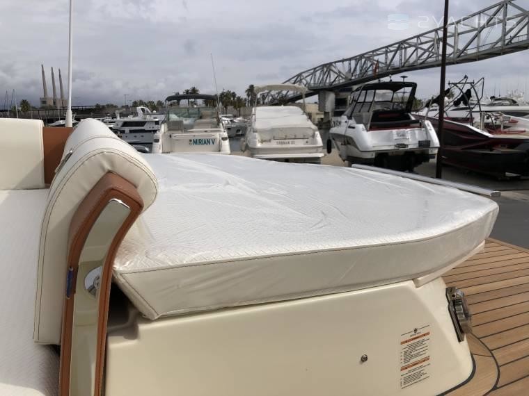 Barco equipado, además de su equipo estandar, incluye: Color del casco en Dark Shadow suelo de teca en plataforma de baño, frigorífico en cabina Mesa de bañera en teca, equipo HiFi con 2 altavoces, lona de consola, lona de asientos de piloto convertibles en asientos de bañera, lona de solárium de popa, VHF Garmin 315i, Kit volante regulable en altura, hélice de proa, Kit toma de 220v, ducha de agua dulce en popa, toldo Bimini escamoteable, pasamanos altos de acero inox, fregadera en bañera, molinete eléctrico con ancla y cadena