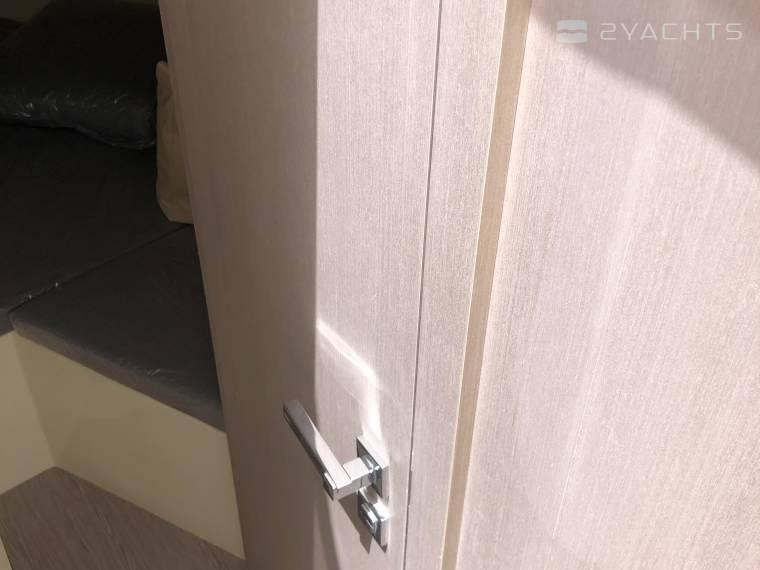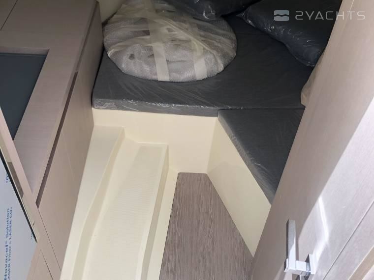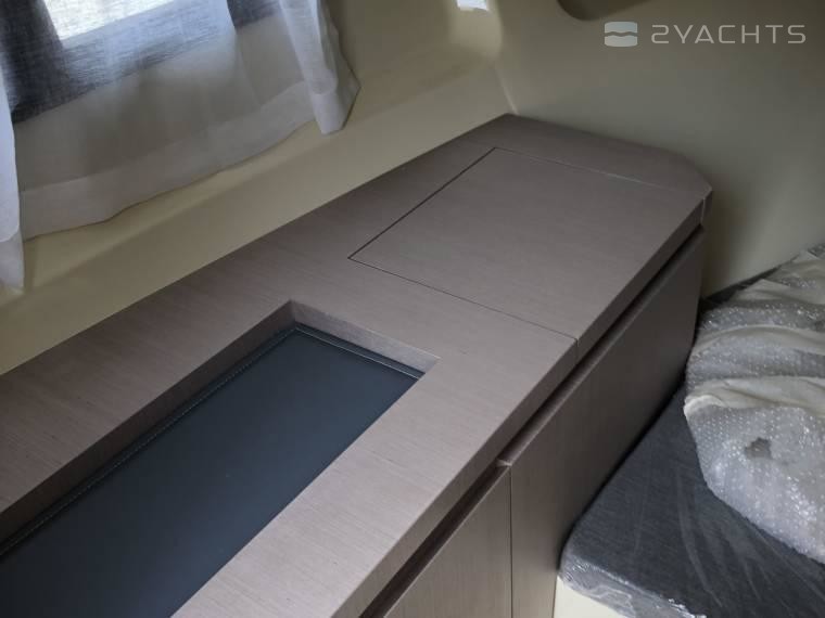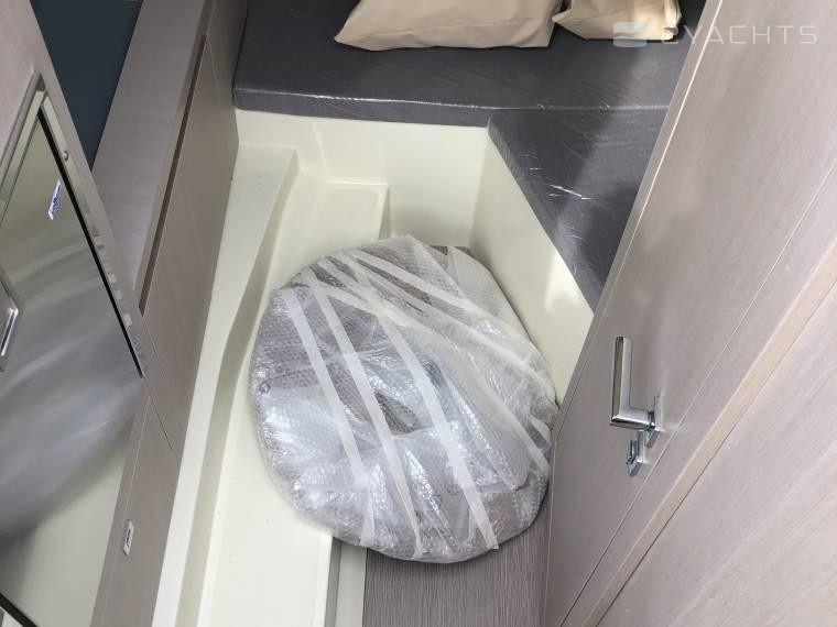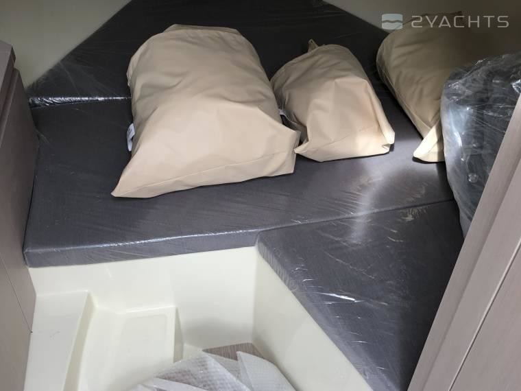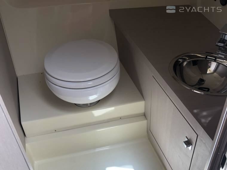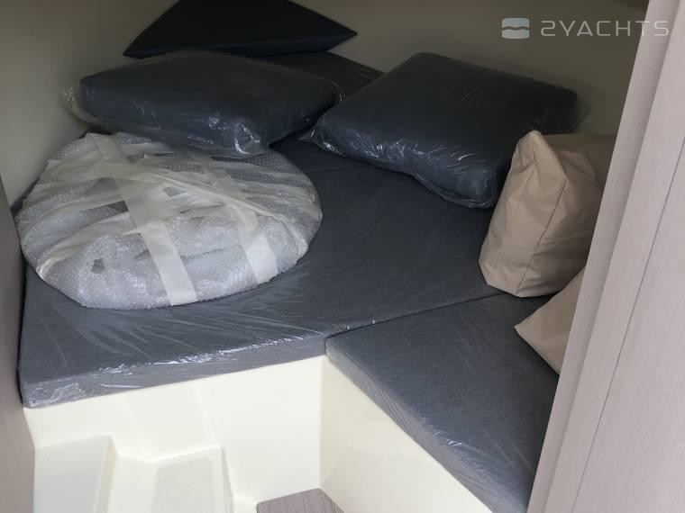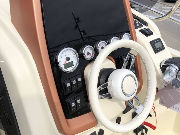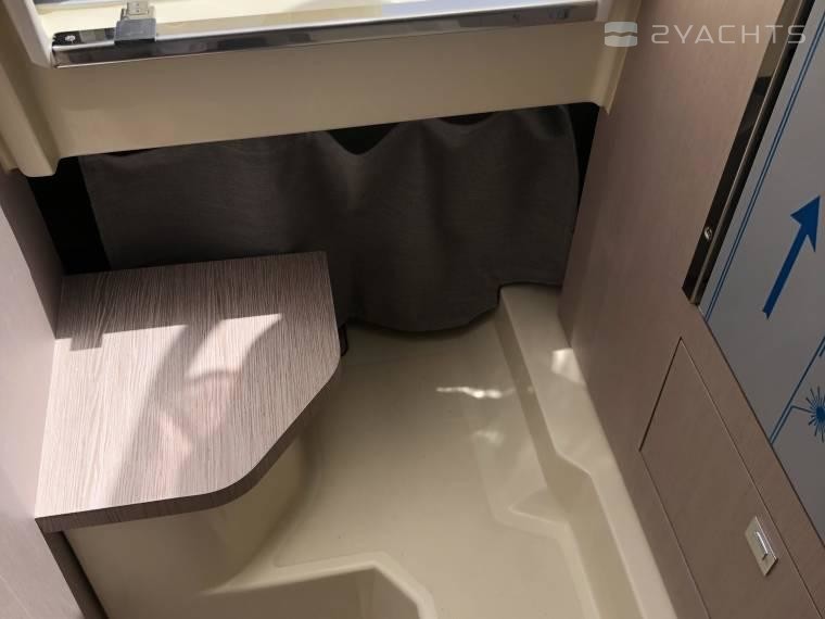 Barco equipado, además de su equipo estandar, incluye: Color del casco en Dark Shadow suelo de teca en plataforma de baño, frigorífico en cabina Mesa de bañera en teca, equipo HiFi con 2 altavoces, lona de consola, lona de asientos de piloto convertibles en asientos de bañera, lona de solárium de popa, VHF Garmin 315i, Kit volante regulable en altura, hélice de proa, Kit toma de 220v, ducha de agua dulce en popa, toldo Bimini escamoteable, pasamanos altos de acero inox, fregadera en bañera, molinete eléctrico con ancla y cadena