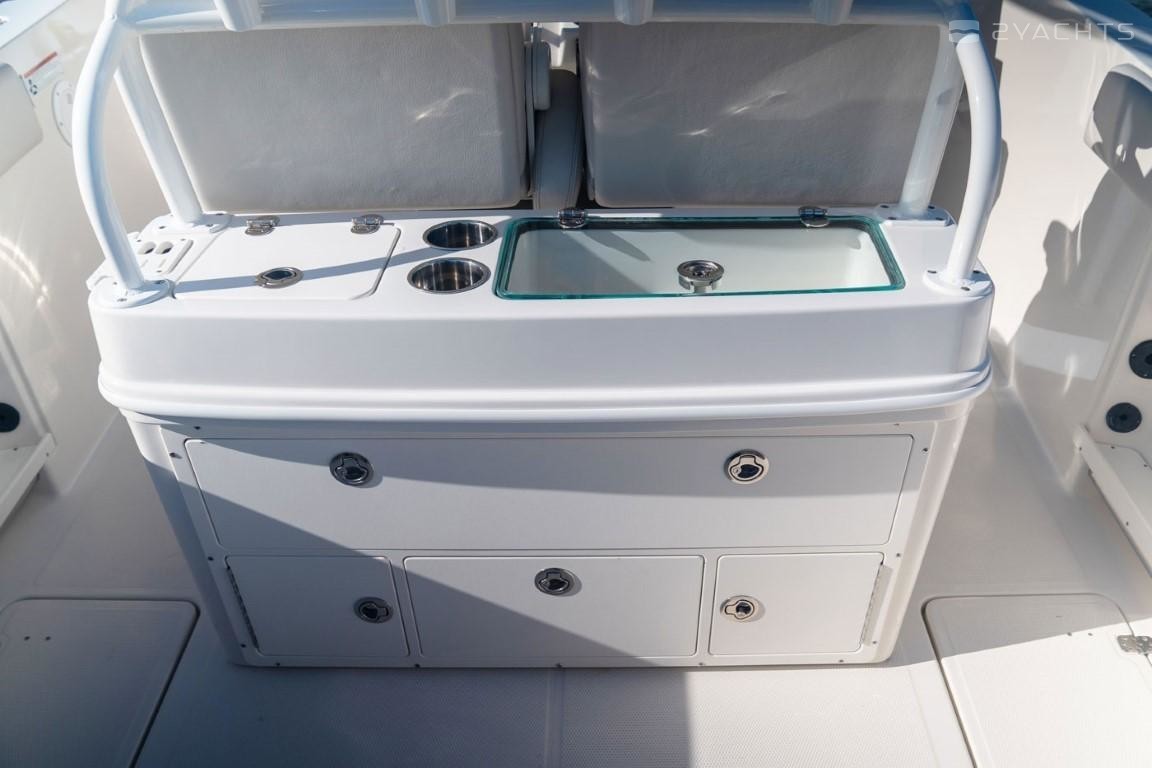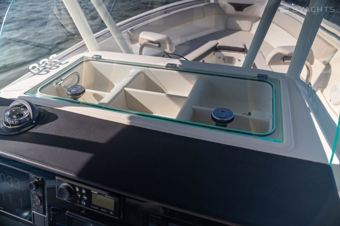The helm includes VHF Radio and Antenna, Garmin B75M Airmar thru hull transducer with CHIRP, Garmin radar cable and power cable, compass, footrest, full digital instrumentation, accessory switch panel with circuit breakers and a electric horn..