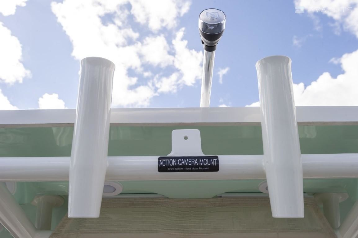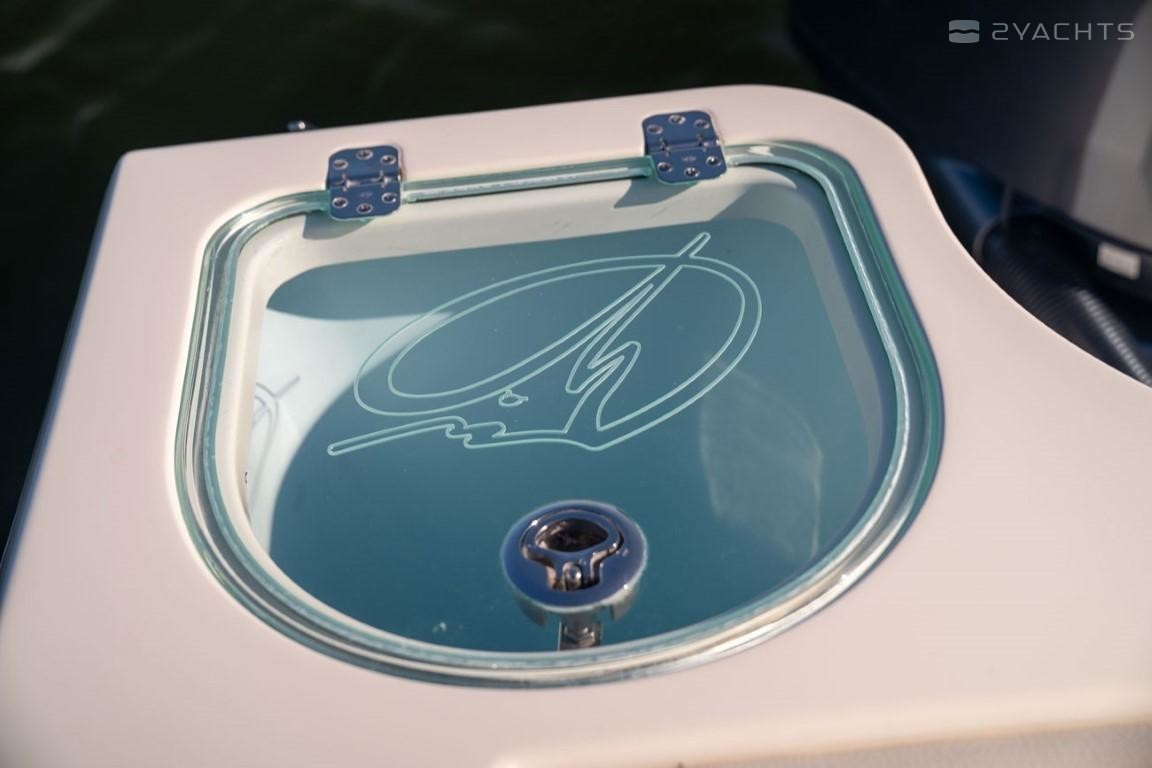 Other features include the Entertainment Package which includes a ski tow bar, a removable bow table, and Fusion transom remote. Other features includes built-in 3 bank battery charger with LED readout, two tone hard top, Bow Rod Holders, Captain's Anti-Fatigue Pad and Yamaha Joystick.
