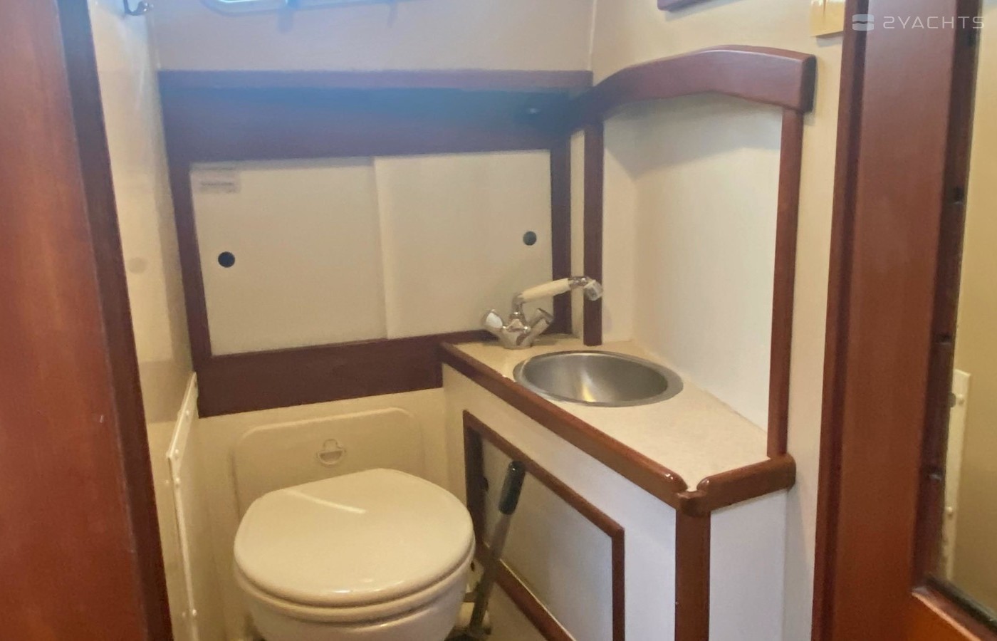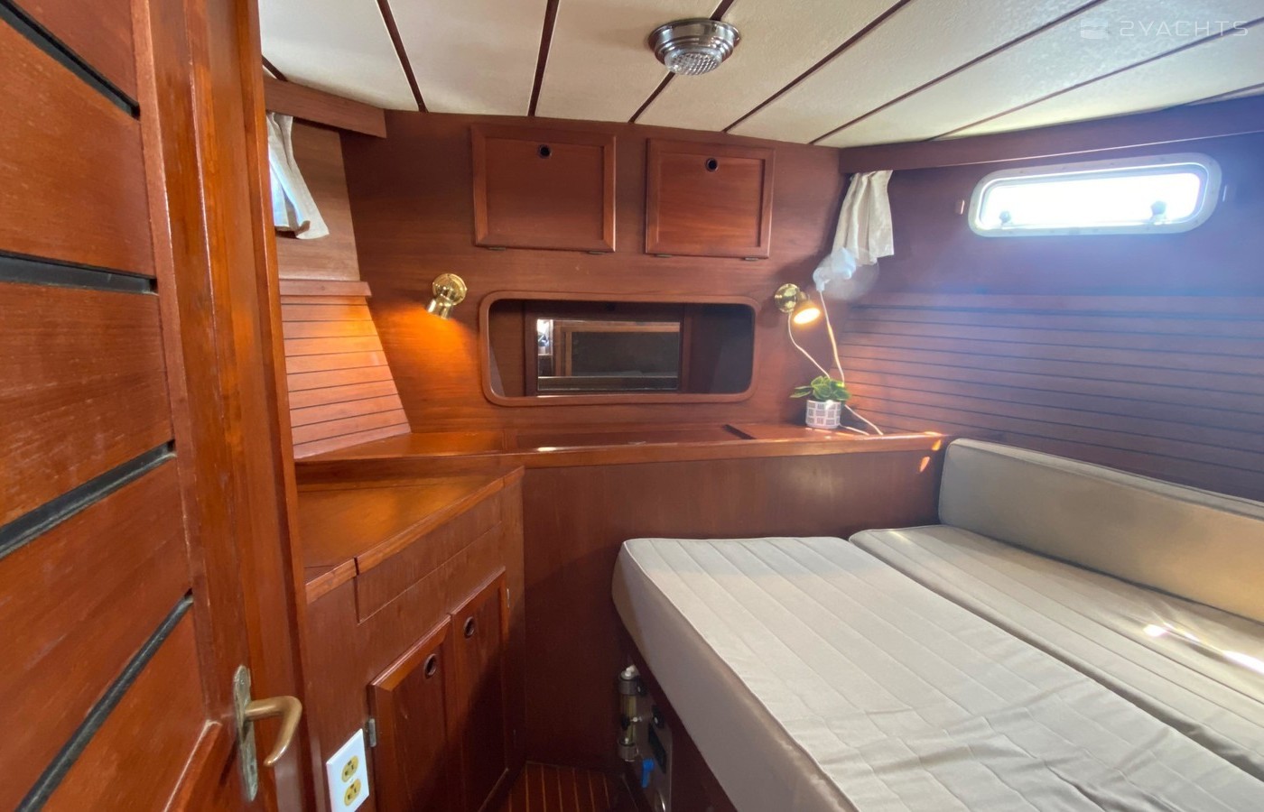 Huge V-berth forward easily sleeps 2 adults. It can be set up as a traditional V, or a cushion can be added to make the entire cabin a berth with closet space under the added cushion. As you move toward the aft, the head is on the port. Manual bronze Groco type K head, sink, and shower. The head is as solid as they come and will be around long after we’ve all moved on. Large storage cabinet to starboard across from the head. Can be used as traditional hanging cabinet, but also has several shelves for better utilization of the space.