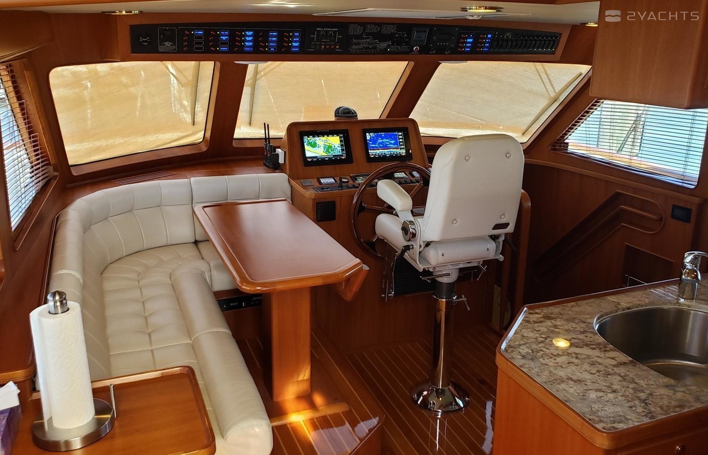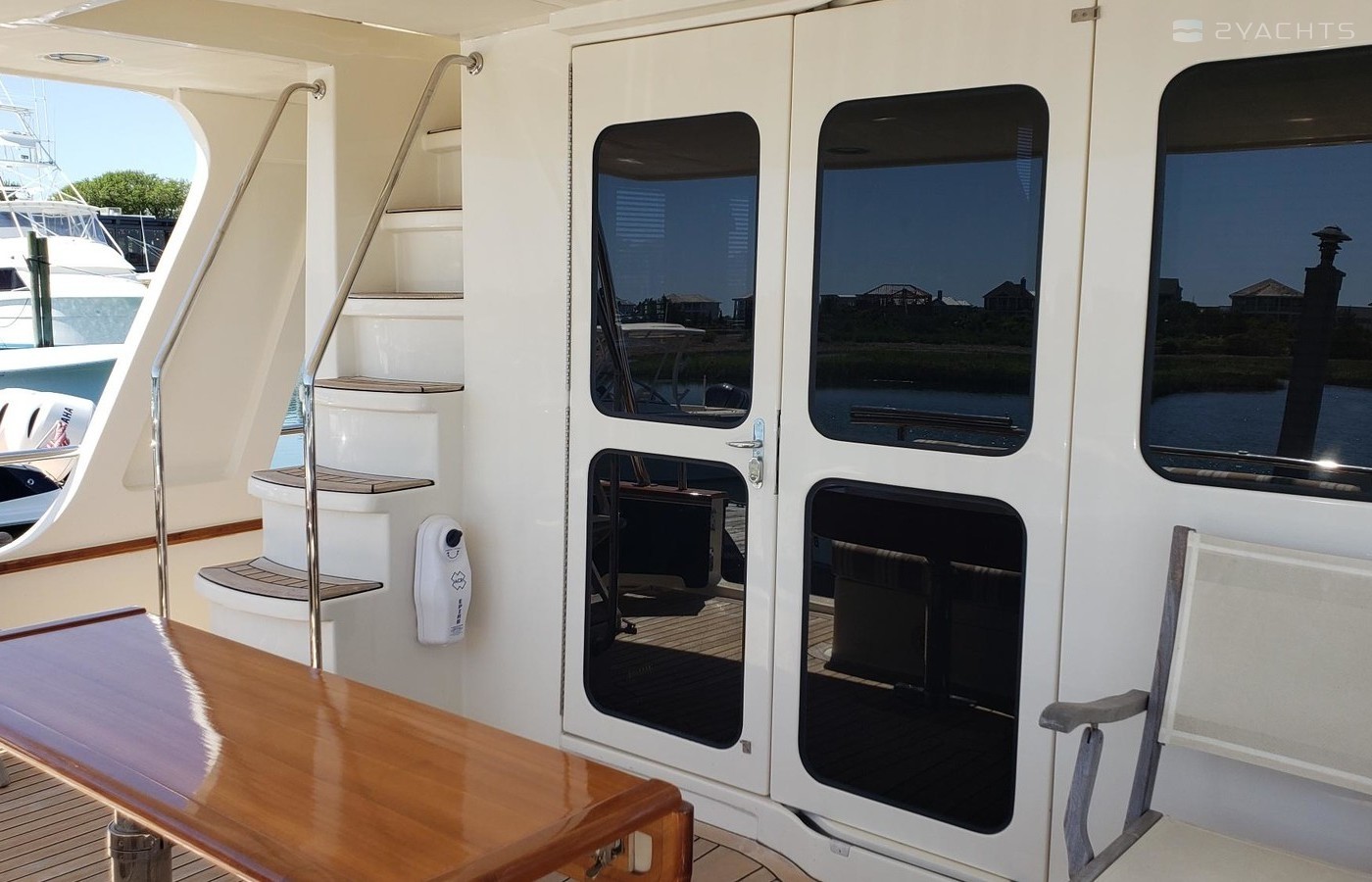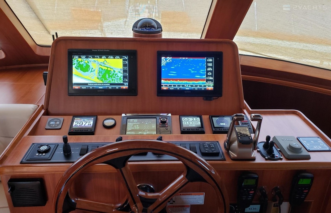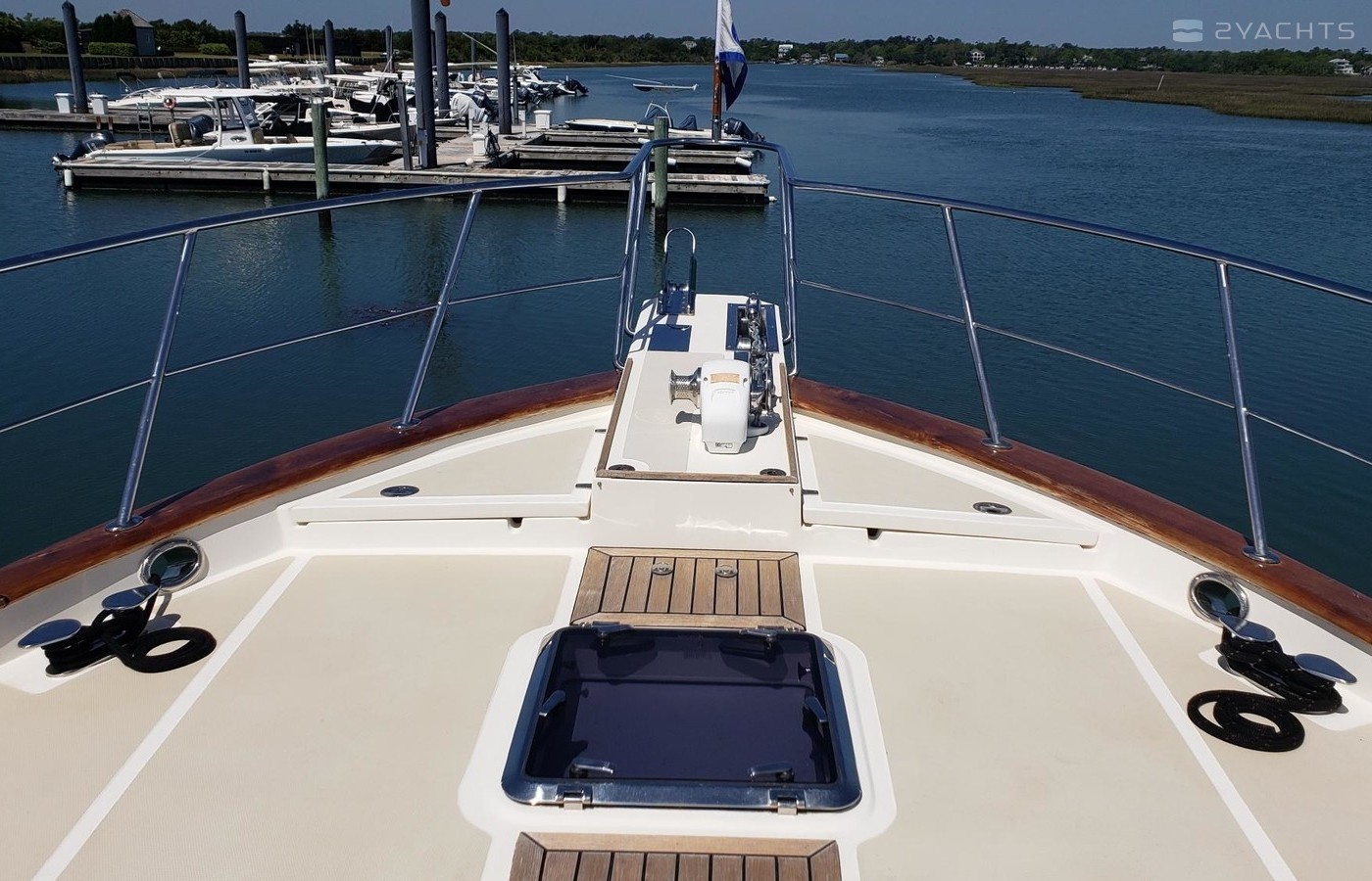The raised pilothouse, Portuguese bridge, wide side decks, and state of the art semi-displacement hull makes the Marlow Explorer one of the most comfortable, safest yachts in any sea condition. The side decks are fully protected by fiberglass bulwarks topped with teak cap rails that are waist high aft and higher forward. The stainless-steel anchor is set up with all chain on the dual gypsy windlass. The bow rail is heavy oval stainless-steel package. Both the pilothouse and the hard top semi covered flybridge offer great vantage points and visibility with socially inviting settings and for piloting the yacht. When piloting inside close quarters one can utilize the aft deck helm station easily located starboard next to the convenient sink and storage cabinet for easy access and handling.