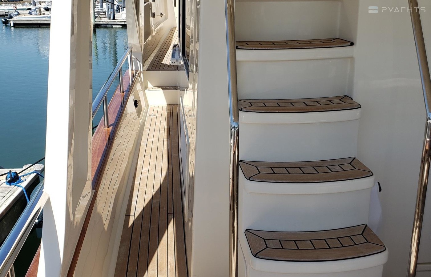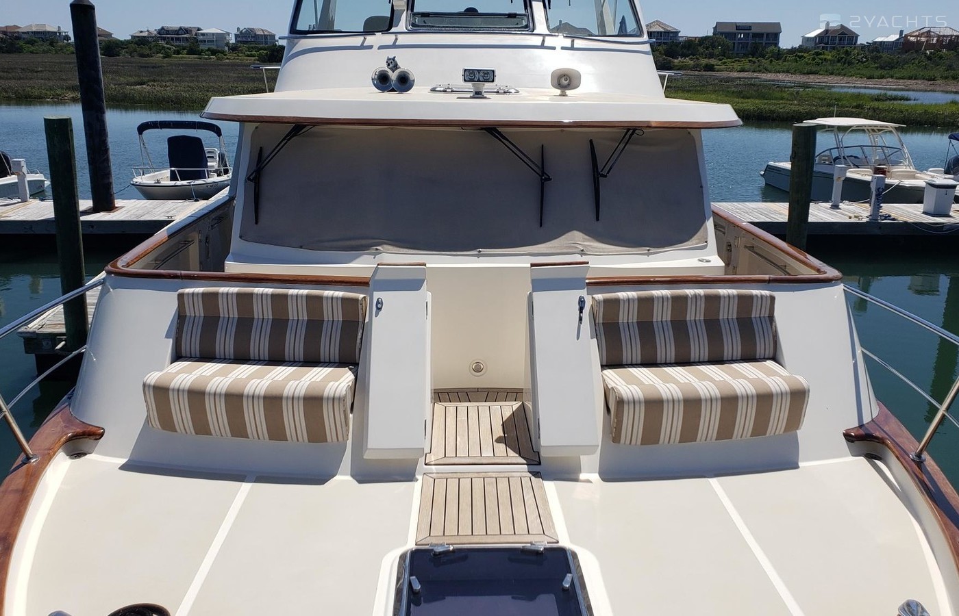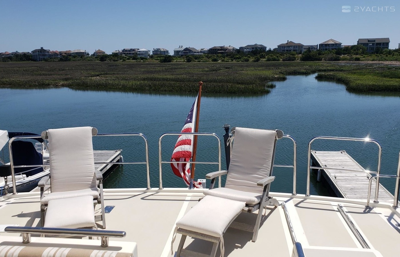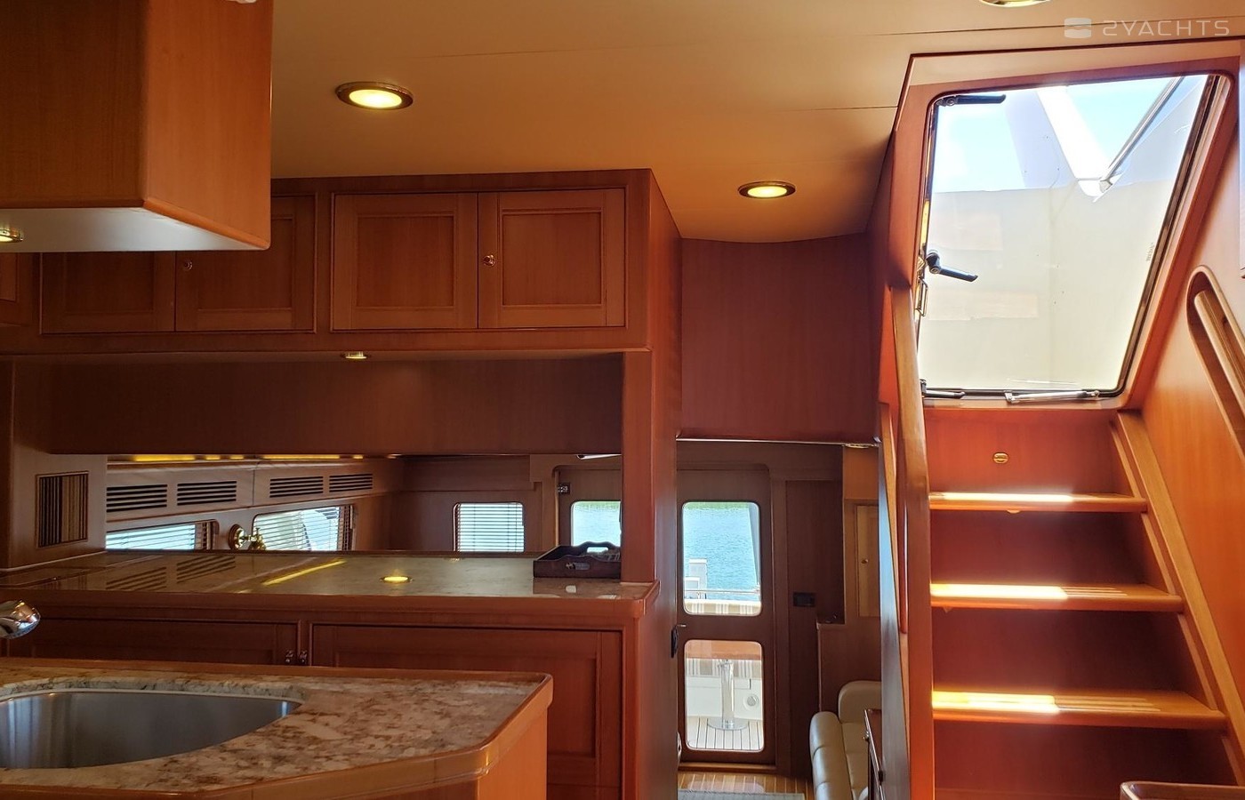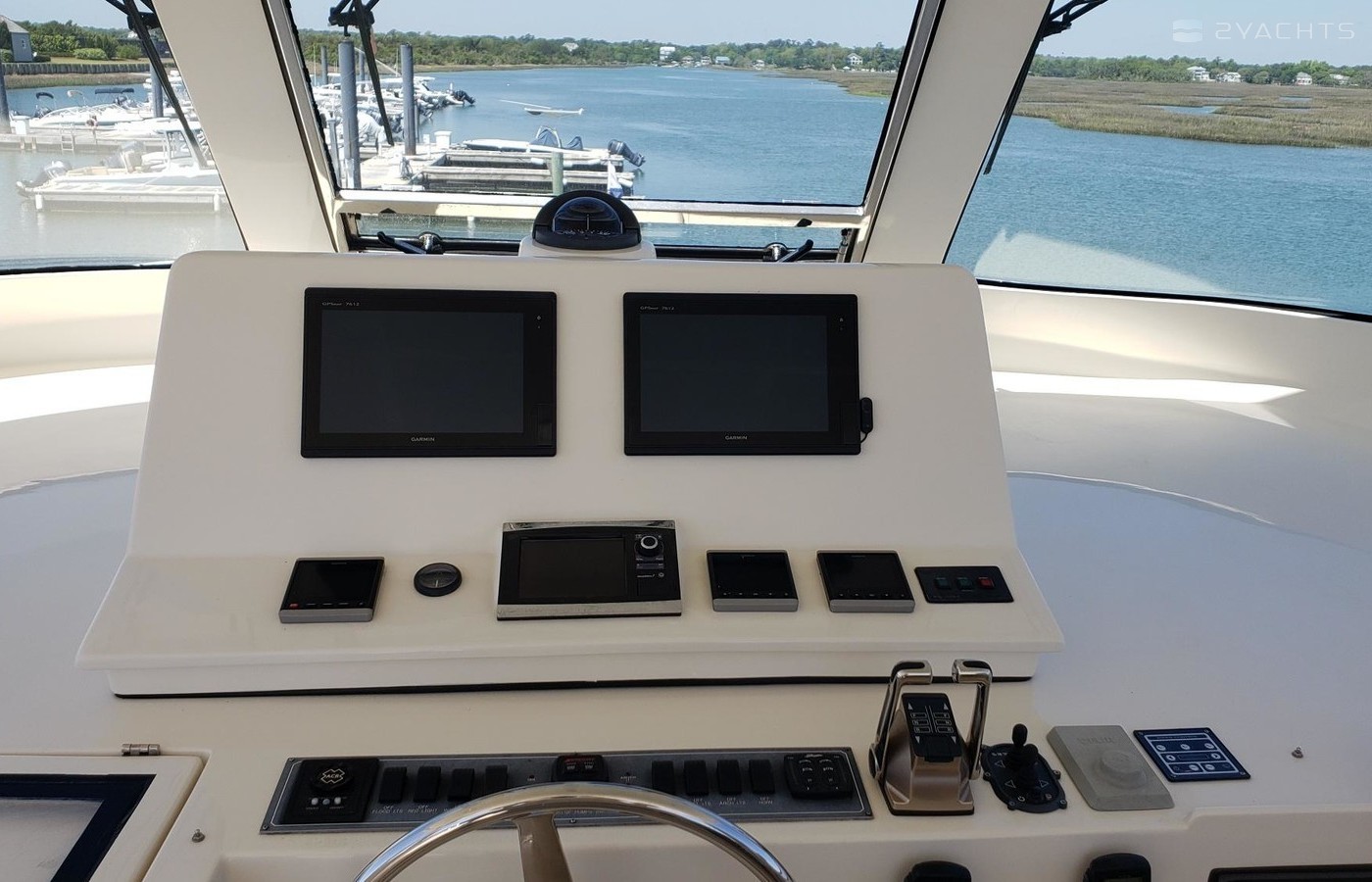 The raised pilothouse, Portuguese bridge, wide side decks, and state of the art semi-displacement hull makes the Marlow Explorer one of the most comfortable, safest yachts in any sea condition. The side decks are fully protected by fiberglass bulwarks topped with teak cap rails that are waist high aft and higher forward. The stainless-steel anchor is set up with all chain on the dual gypsy windlass. The bow rail is heavy oval stainless-steel package. Both the pilothouse and the hard top semi covered flybridge offer great vantage points and visibility with socially inviting settings and for piloting the yacht. When piloting inside close quarters one can utilize the aft deck helm station easily located starboard next to the convenient sink and storage cabinet for easy access and handling.