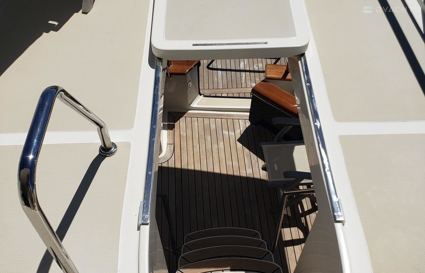 Upon boarding you walk though the double entry composite and glass doors to the salon that sound like bank vaults when closing. You will notice the beautiful panoramic views throughout the vessel through the 3 layered tempered glass with hurricane shield quality windows which are 13mn thick. Enjoy the (2) elegantly tufted designed settees which are strategically placed, one on each side, starboard and port side for generous seating when entertaining or dockside loafing. Extra added storage compartments are located underneath both settees. When looking port side aft one can hang special wine glasses and stemware in the specially customized double shelf cabinet for exceptional beauty and functionality creating even more excellent storage features. Looking forward you can easily view the 40” Samsung TV and portside you can enjoy your beverage center refrigerator as well as an added wine cooler for additional luxury when storing your favorite Chardonnay on those gorgeous late afternoon sunsets while toasting together with friends and family in this exciting world of yachting.
