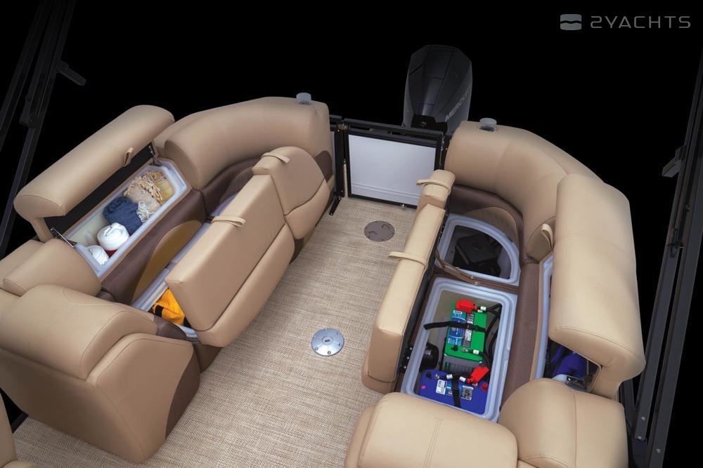 • Wraparound bow port lounge w/STOW MORE™, extra-deep cushions, pillowtop backs, lumbar support, lockable underseat storage & lockable arm storage