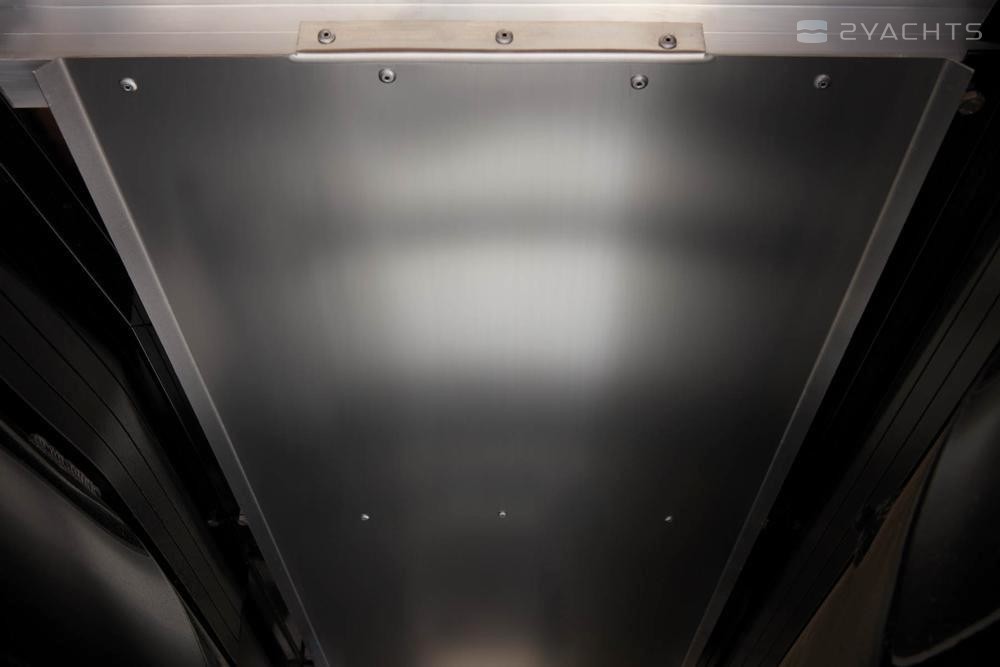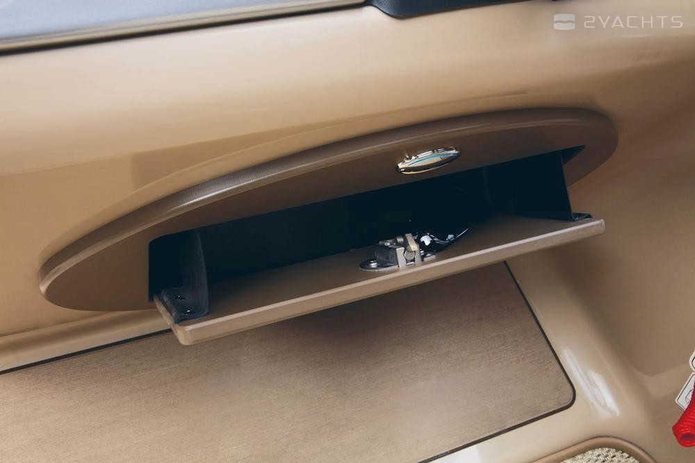 A richly appointed interior is ideally suited for cruising or lazing away the day with plush, handmade seating that conceals a world of storage. Forward and aft lounges offer the perfect platform for socializing and taking it all in while the swiveling helm and passenger seats feature self-leveling armrests, superior support, and a commanding view of the water. Underfoot lies bow-to-stern soft-touch woven flooring that stays cool and grippy all summer long.