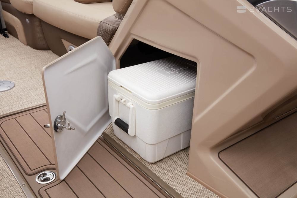 • Wraparound bow starboard lounge integrated into console w/STOW MORE™, extra-deep cushions, pillowtop backs, lumbar support & lockable underseat storage