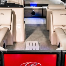 The Blue underwater, cupholder & courtesy lights create a beautiful ambiance for evening cruises, while the Lounge end table adds a touch of elegance and luxury to your boating experience. The Ski locker provides plenty of storage space for all your equipment, and the Lowrance System keeps you connected and informed while you're out on the water. With the JBL sound system, you can enjoy your favorite tunes with high-quality sound, making your boating experience even more enjoyable.