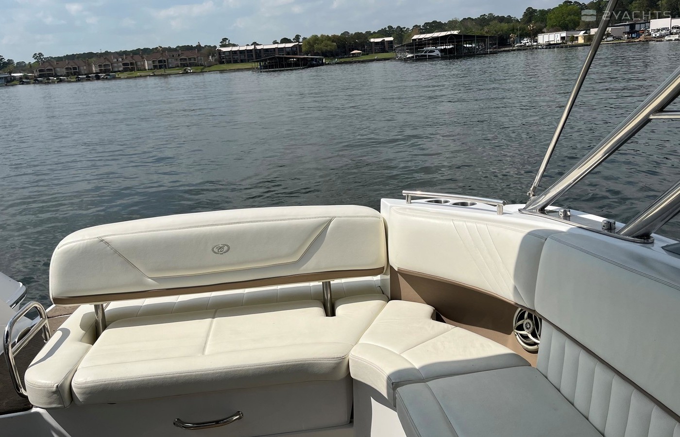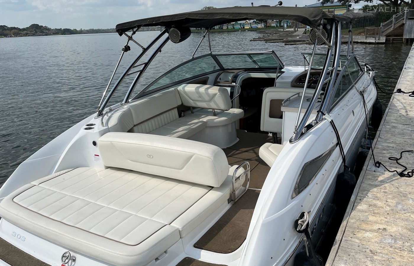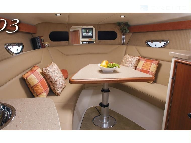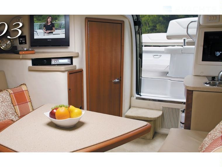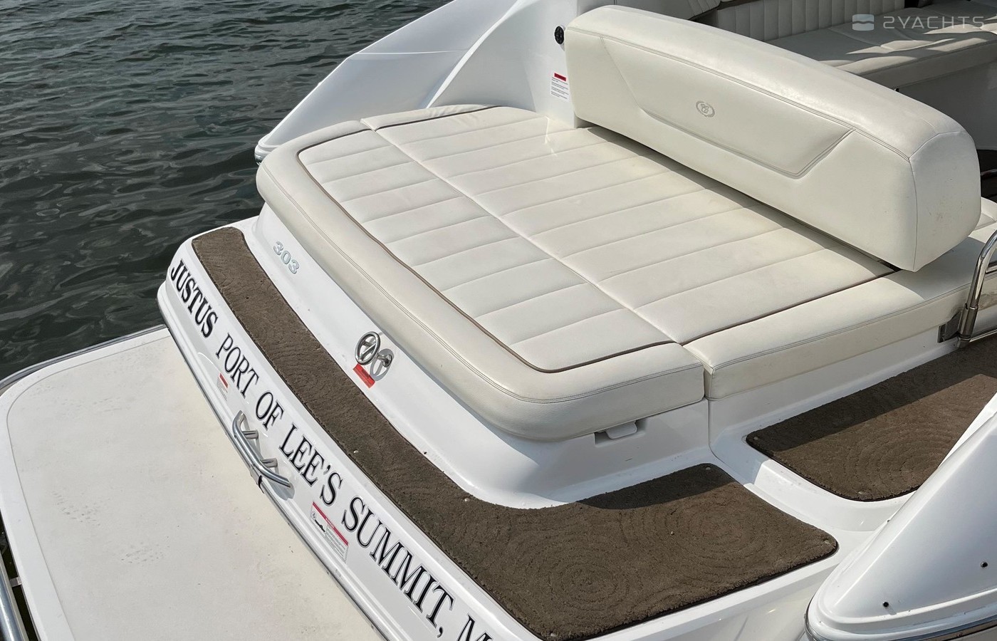 The 303 is a true dayboat with unmatched size and conveniences for entertaining or a night away. The cockpit fans out from a hot-water sink and refrigerator with a built-in ice chest nearby. And a design element as basic as seat positioning does wonders for onboard interaction -- the double wide cockpit passenger seating facies forward or aft, thereby pulling onboard guests together in clear, quiet conversation. The amenities such as AC/Heat, Generator, Fridge, Toilet, Stove and Sinks are central to the enjoyment of family and friends, to the thoughtful use of multiple cubic-feet imaginatively used bow to stern.