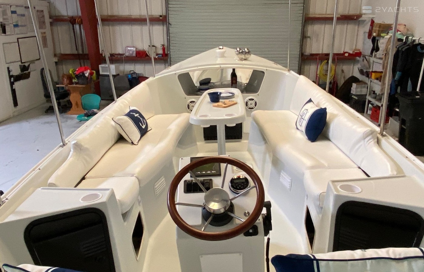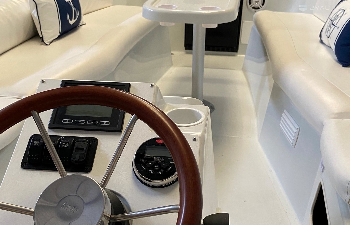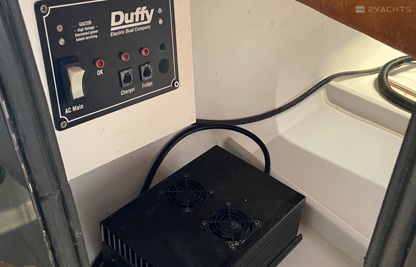 However, we did not stop with only a repower of new technology, but also converted every inch of this classic boat with:• New AC/DC bow 12V marine refrigerator, which keeps its contents cold on shore power or battery powerwhen cruising• New 12V AGM house battery automatically charged by the new Victron DC to DC converter• Two ~ new water-sensing bilge pumps• New hoses• New thru-hulls• New shore power receptacle• New 50’ shore power cord• New rub rail• New sheer and boot striping (along with your choice of a complementary vinyl name and port, installed onthe transom)• New LED energy saving LED interior and running lights• New USB and 12V charging receptacles,• And then relax into the comfortable surround seating while listening to the new 4 -speaker, Bluetooth soundsystem, all underneath the cooling shade of the new Duffy factory-made, navy-colored Sunbrella surreytop and its matching helm cover.• Also included in this Duffy Classic package is the boat’s existing cockpit cover and full window enclosure inteal color.