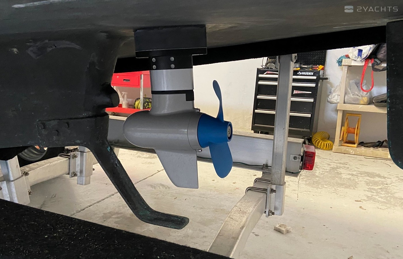 Begin with the removal of the antiquated, brushed golf cart inboard motor and its noise-producing, belt driven propeller shaft ~ to the latest innovation of the brushless and silent ePropulsion Navy 3.0 Evo pod motor system, its CAN bus communicating components, its side throttle and Bluetooth display for your cruising and range details at a glance.
