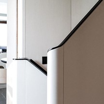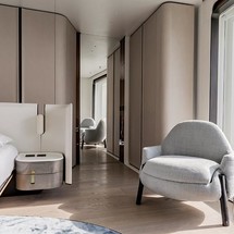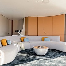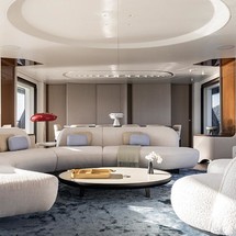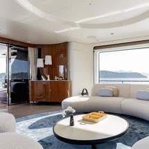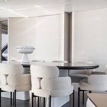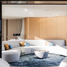 The circular lounging island at the entry of the main deck proves that space is a luxury, taking thoughtful advantage of the furniture arrangement to provide clear views through full-height windows and separate pathways on either side; one for the guests and one for the crew. Between the 270-degree view onto the sea and the sculpted galley bulkhead, which artfully imitates waves, the dining arrangement observes nautical tradition with radical openness.