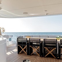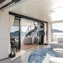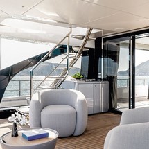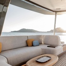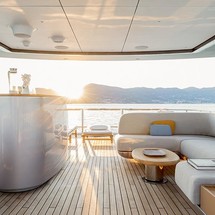 The sundeck is particular among the outdoor spaces, offering every essential for hosting in an intimate setting. The cockpit blends the beach area together with the main deck, with sheltered, open-air dining and an American bar.