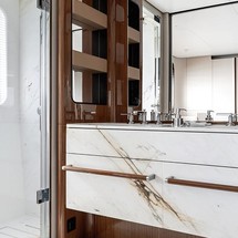Master cabin bathroom with central sink, starboard side WC and portside shower