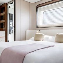With the AZIMUT GRANDE 36 METRI, Azimut introduced the first semi-walkaround upper deck that runs flush from the stern to almost the extreme bow, offering unprecedented freedom of movement. The side windows are fully retractable, joining the skylounge with the aft terrace to create an immense barrierless area. Wrapping around to the bow, we come to a whirlpool tub made entirely of glass and a sunbathing area equipped with every comfort.
