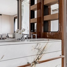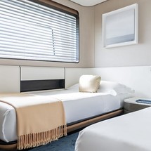 Navigation is made extremely comfortable thanks to zero speed and underway stabilizers as well as powerful propulsion comprising twin 2200 Hp MTU diesel engines delivering a top speed of 24 knots and a cruise speed of 18 knots.
