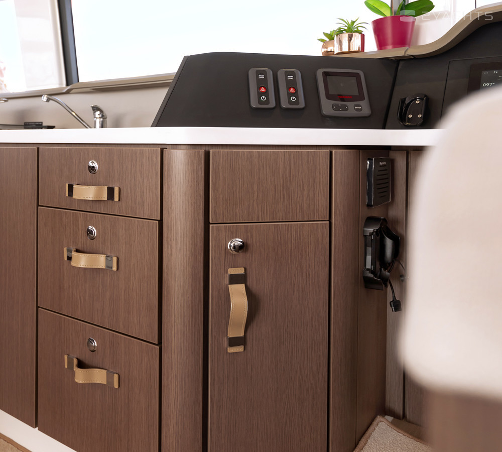 Auf dem Außendeck des Cockpits ist ein weiches Sofa installiert, das sich in eine geräumige Liege verwandelt. An den Seiten gibt es Gehwege zum Heck, die mit einer Plattform mit einer Leiter für den Zugang zum Wasser, einer Anhängerkupplung und Metallhandläufen ausgestattet sind. Der Katamaran ist mit zwei stationären Motoren mit einer Leistung von 160 PS ausgestattet, die Kapazität seiner Tanks für Kraftstoff und Frischwasser beträgt 800 Liter.