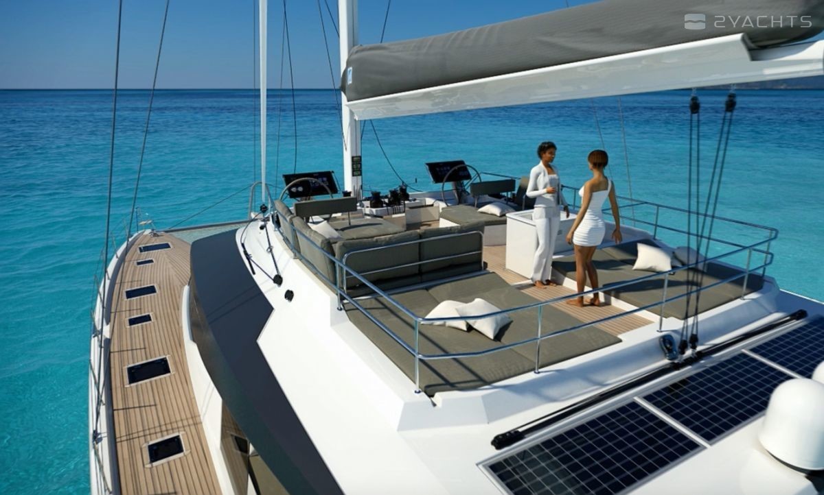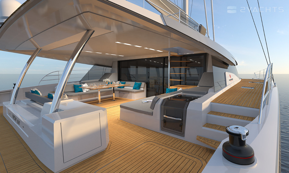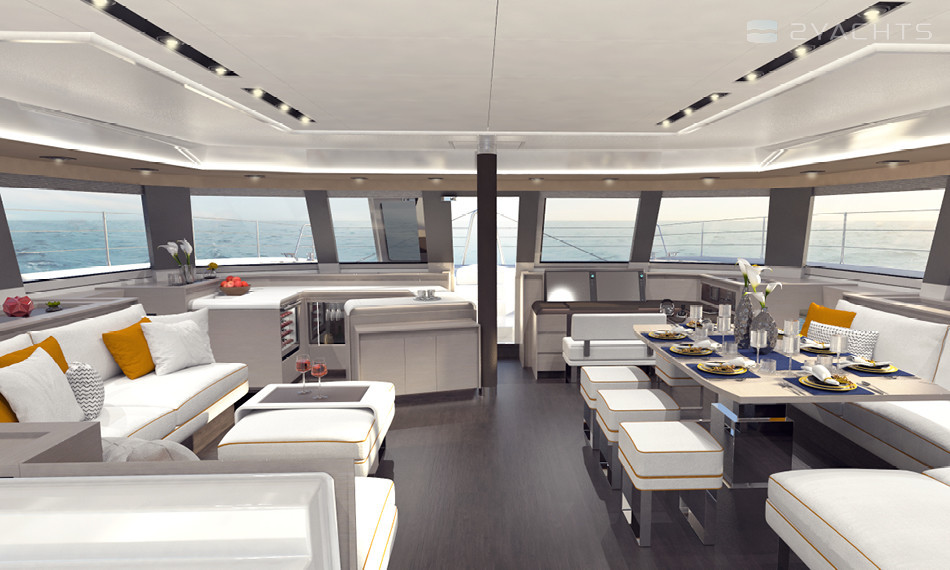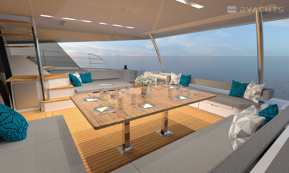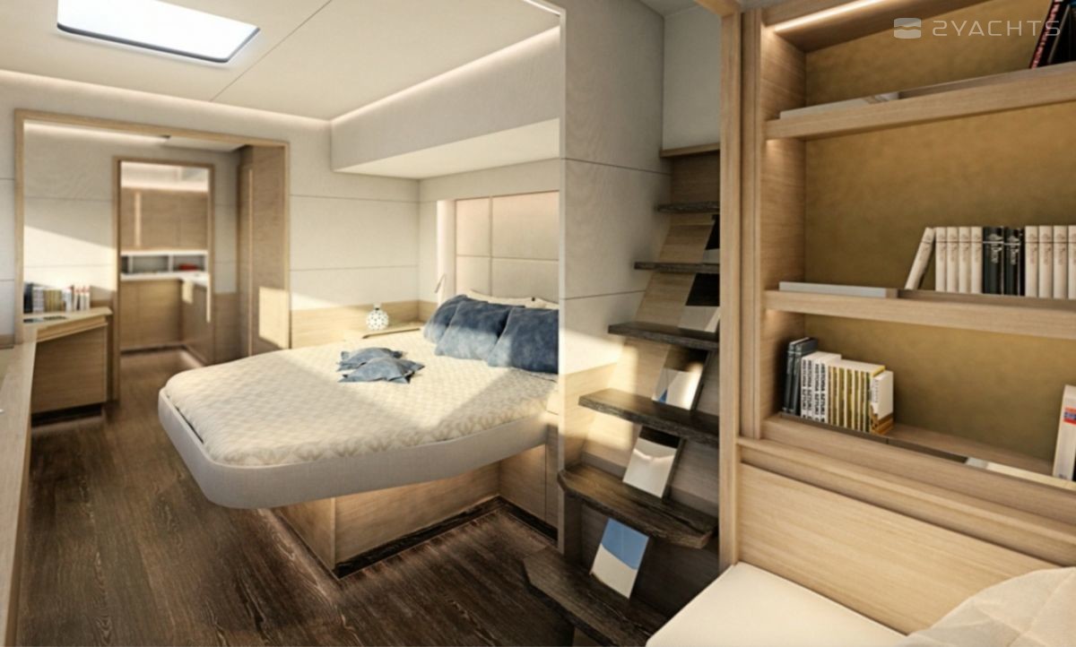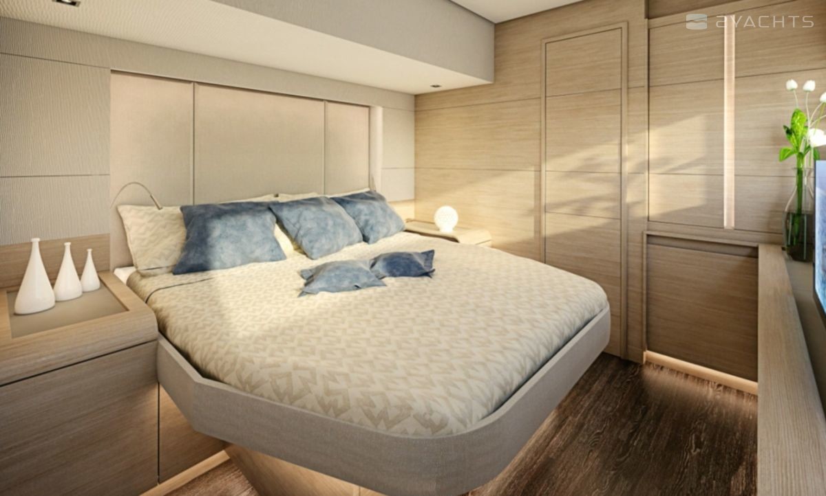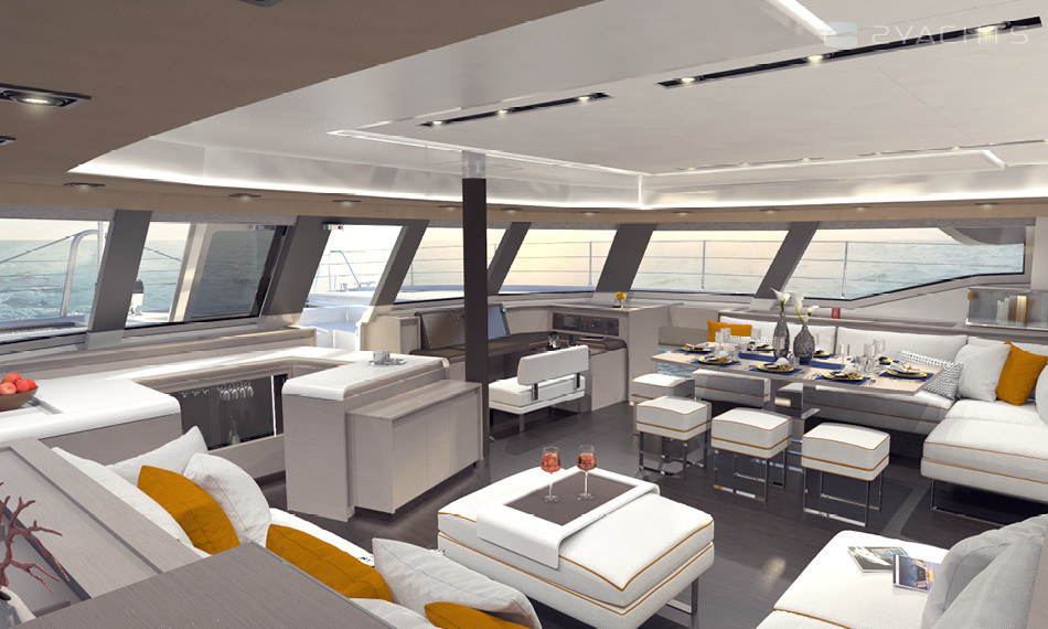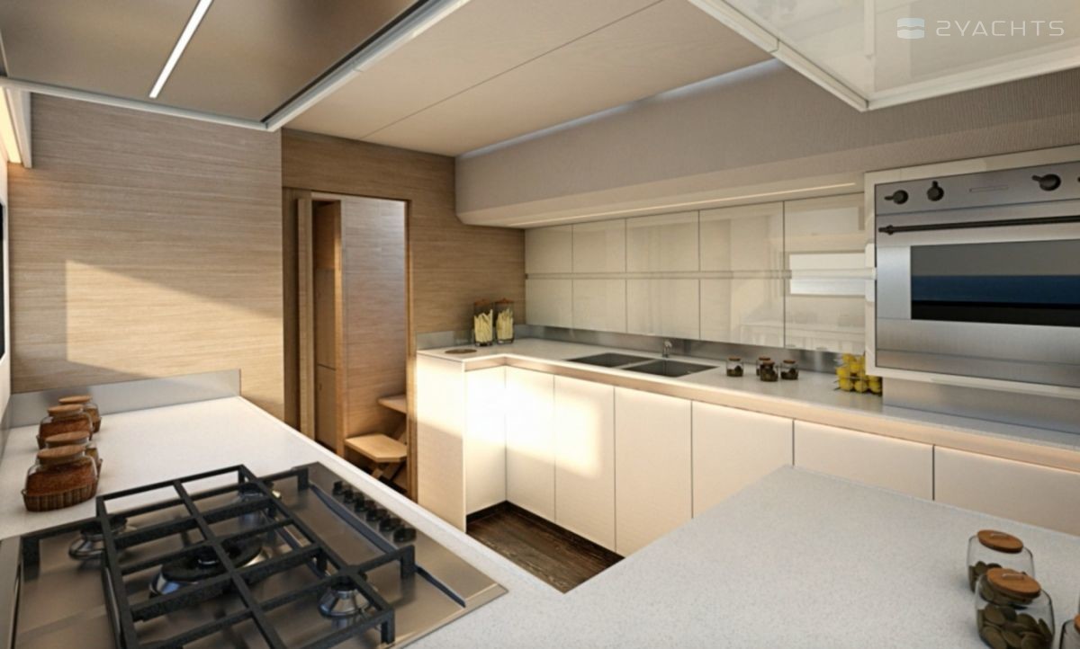 Auf der Flybridge mit einer Fläche von 32 qm Ein Backup-Kontrollposten mit einem Skippersessel wurde installiert und ein Erholungsbereich mit Sonnenliegen, einer Minigaleere und Sofas wurde gebildet. Der geschlossene, mit Panorama verglaste Mitteldeck-Salon beherbergt die Hauptsteuerstation, mehrere Cabrio-Sofas und einen Esstisch. Das Cockpit verfügt über einen Cocktailbereich mit Zugang zu einer Badeplattform mit versenkbarer Gangway.
