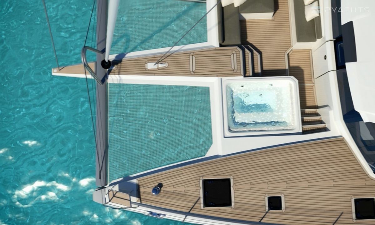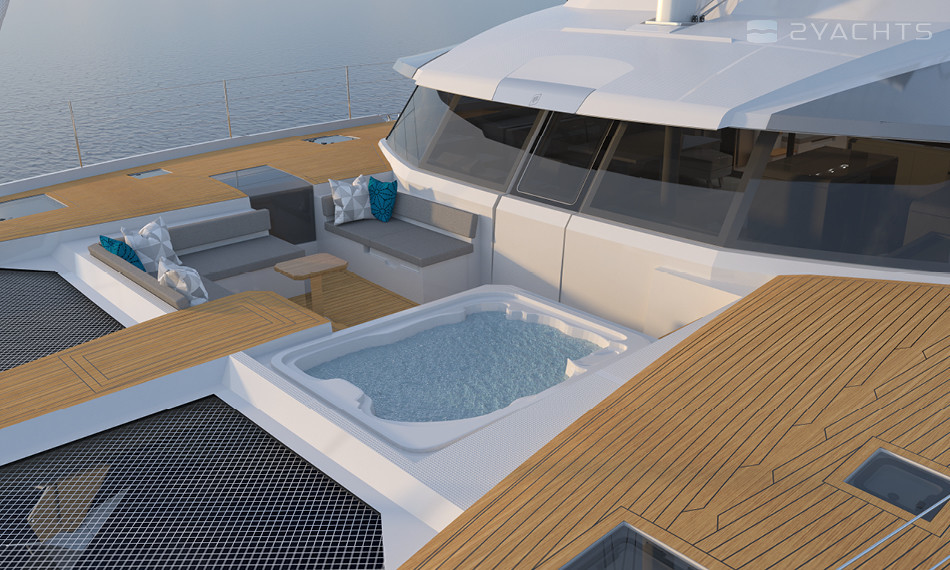 Im Bug des Mitteldecks befindet sich ein 45 m² großer Sitzbereich mit Sonnenliegen und optionalem Whirlpool.
