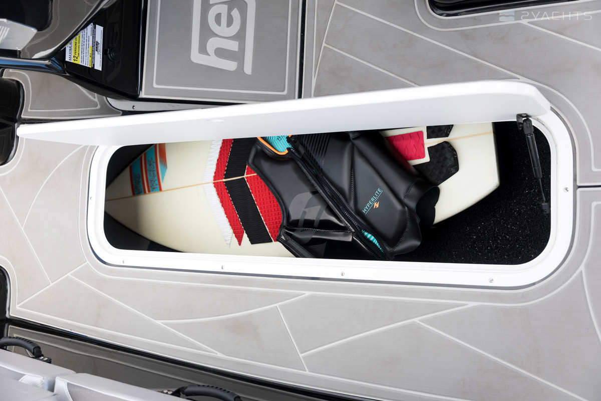 Das Boot ist mit einem abnehmbaren Bogen mit Halterungen für Wasserski ausgestattet. Es hat eine klappbare Markise, die das Cockpit vor der Sonne schützt. Am Heck des Heyday WT-2 befinden sich zwei Sonnenliegen zum Sonnenbaden, zwischen denen sich ein Schließfach für persönliche Gegenstände und Ausrüstung befindet. Als nächstes wird eine abnehmbare Plattform für den Zugang zu Wasser installiert, über der eine Abschlepphalterung montiert wird.
