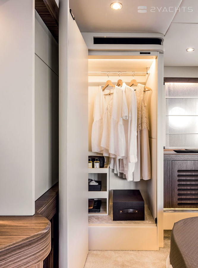 Im Cockpit des Schiffes befinden sich ein geräumiges Sofa, eine bequeme Sonnenbank zum Bräunen und ein Edelstahlgeländer an den Rändern. Die Tür zum Cockpit besteht aus Bio-Glas und Edelstahl, und die Anti-Rutsch-Beschichtung garantiert die Sicherheit der Passagiere. Bei der Herstellung von Möbeln auf dem Hauptdeck wird Canaletto-Walnuss mit einem matten Finish verwendet, ein U-förmiges Sofa wird mit Leder ummantelt und eine dreiblättrige Tür mit getöntem Glas führt zum Salon.