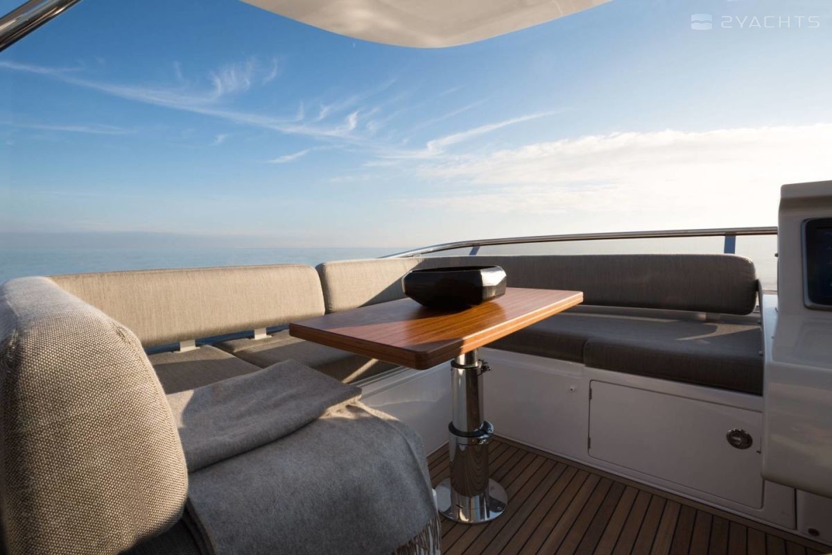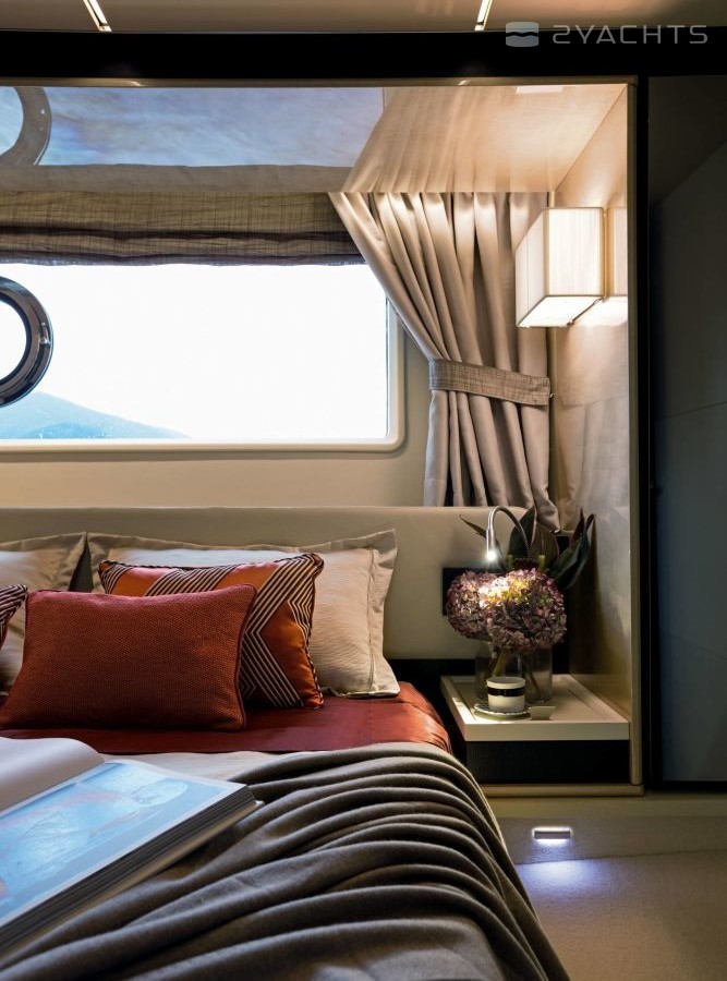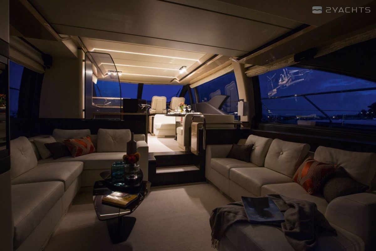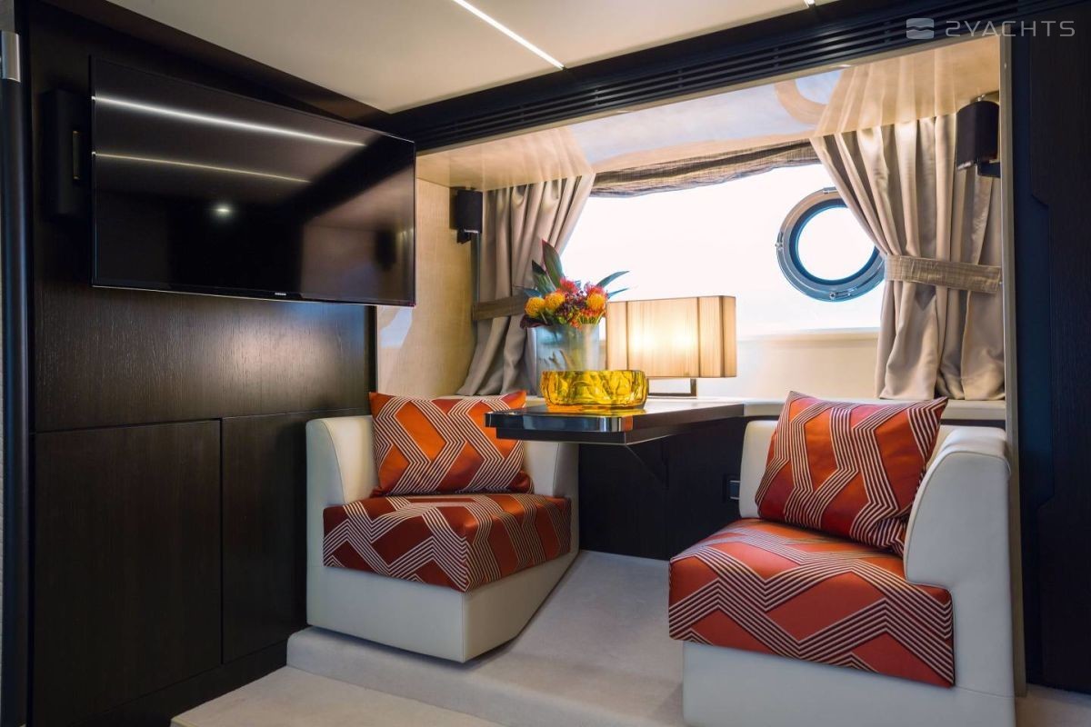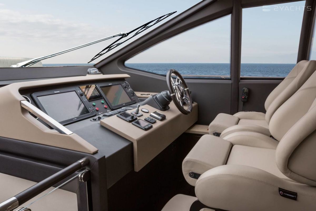 Durch die Panoramaverglasung des Azimut 66 ist die Kabine mit Tageslicht gefüllt. Im Cockpit befindet sich ein C-förmiges Sofa mit einem Tisch, und im Bug, auf dem Hauptdeck, gibt es einen Platz zum Entspannen mit Sonnenliegen. Das Innere der Motoryacht besteht aus Eichenholz und Bergahorn, und für Liebhaber von hellen und beige Farbtönen wird eine Kombination aus Ebenholz und Eichenholz angeboten.
