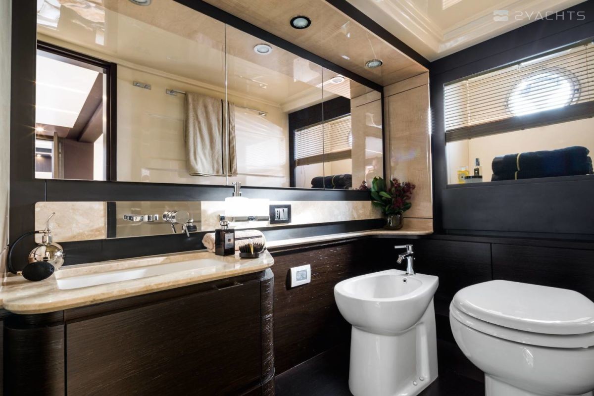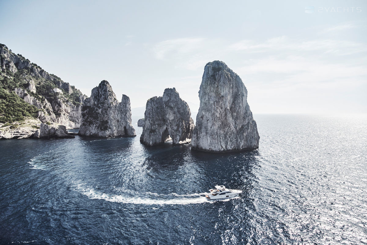 Azimut 66 ist für den Betrieb innerhalb von 200 Seemeilen vor der Küste zertifiziert. Die Leistung von zwei Motoren bei 1150 PS ermöglicht es Ihnen, Geschwindigkeiten von bis zu 32 Knoten und eine Kraftstoffversorgung von 3900 Litern, Wasser - 1000 Liter zu erreichen.
