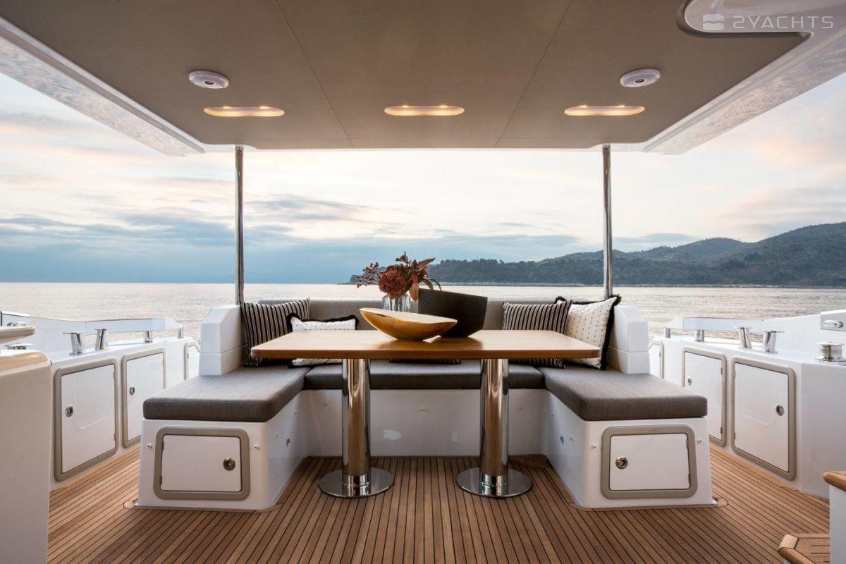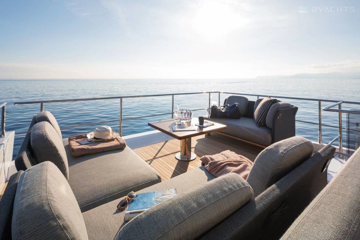 Der Entspannungsbereich mit Liegestühlen nimmt 28 Quadratmeter Deck ein. Polstermöbel wurden speziell für dieses Modell entwickelt und sind in verschiedenen Konfigurationen erhältlich. Zum Entspannen auf dem Deck gibt es ein geräumiges Sofa mit weichen Kissen und ein Bimini-Zelt.