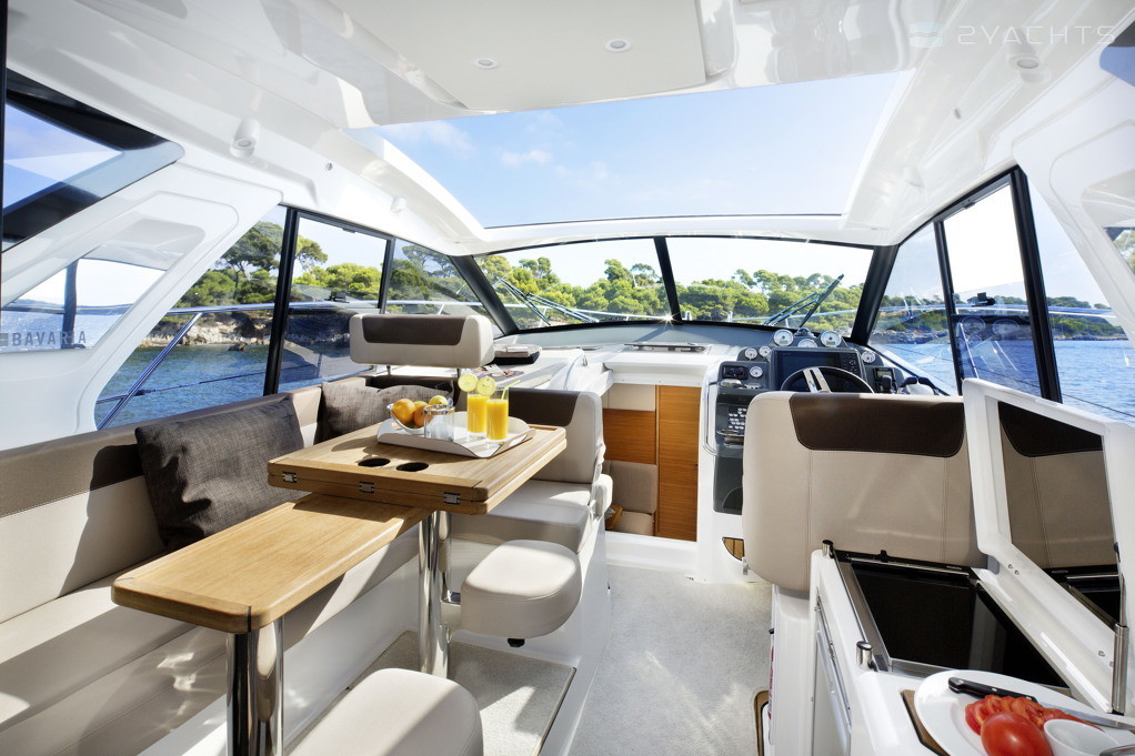 Die Motoryacht Bavaria S36 COUPE wurde 2015 vorgestellt und ist als Sportmodell der S-Line-Serie positioniert. Das Schiff wurde von einem separaten Designbüro der Werft, Bavaria Yachtbau, entworfen, das die Yacht diesmal im mediterranen Stil dekorierte, wie das Geländer mit einer leichten Neigung und hellen Farben der Innenausstattung zeigt, die die Kabinen der Yacht optisch vergrößert. Die Yacht erhielt eine durchgehende Verglasung des gesamten Salons, ein hydraulisches Hardtop zum Öffnen, eine große Anzahl von Bullaugen und Luken in den Kabinen sowie eine Glastür im hinteren Teil des Schiffes, die als Ausgang zur Terrasse dient. Salon Bavaria S36 COUPE ist in drei Konfigurationen erhältlich, die vom Kunden ausgewählt werden können: CLASSIC, MODERN und STYLE. Sie können auch Ihren eigenen individuellen Einrichtungsstil kreieren und die Farbe und das Material der Verarbeitung aus verschiedenen angebotenen Optionen auswählen.